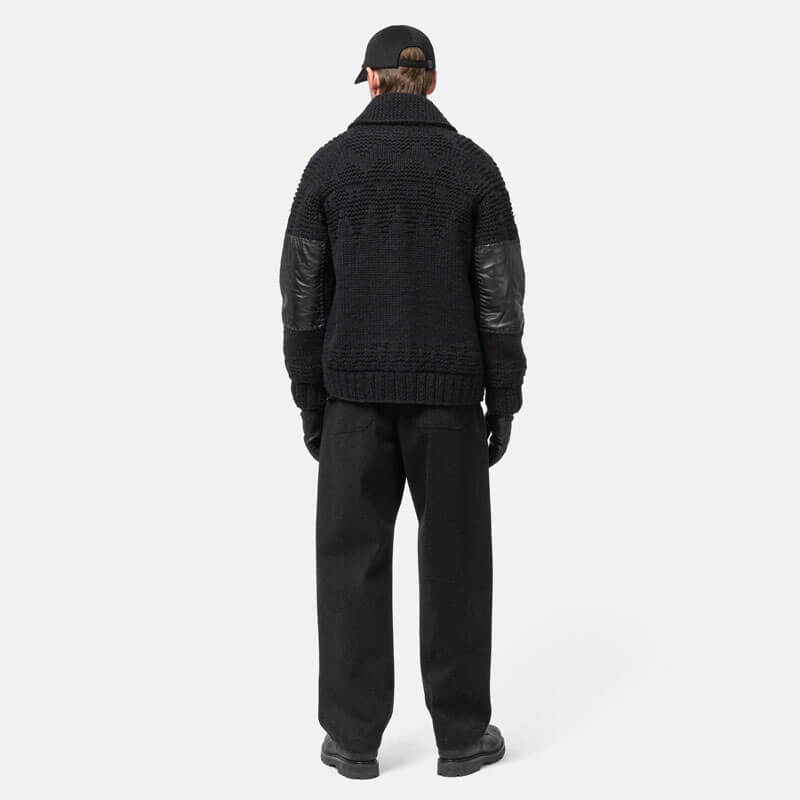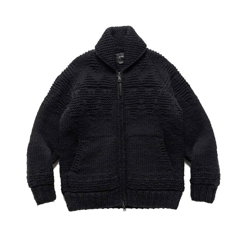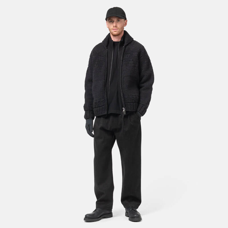 HAVEN Pacific Handknit Cardigan – Wool Charcoal: Drawing inspiration from traditional Cowichan sweaters, the HAVEN Pacific Cardigan is meticulously hand-knit in Canada by master artisans. A tonal reinterpretation of classic Nordic winter patterns is achieved through alternating Purl and Jersey stitches, offering subtle texture and depth. The timeless shawl collar and soft deer leather elbow patches, stitched by hand, provide sophisticated protection. A refined take on classic knits, with its dense wool and simple aesthetic, the cardigan offers warmth and versatility throughout the colder months.