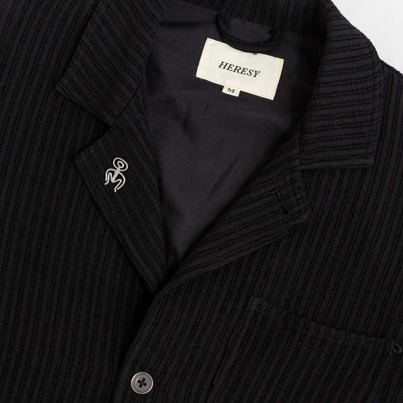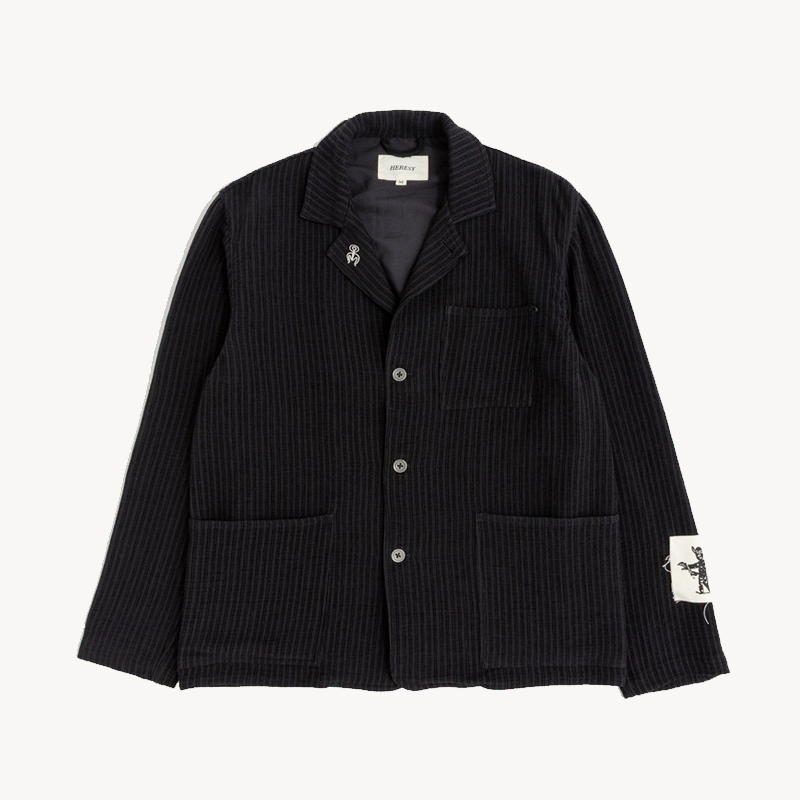 Dominic Owen and Jasper Dunk founded HERESY in 2012, in Peckham, London. Now, based on South England, HERESY produces seasonal clothing collections heavily influenced by the research and exploration of Folklore. Since the start of the company, HERESY has been operating in an ethically conscious manner. Their garments feature bold graphics and illustrations, core to the brand’s visual identity, including hand-drawn sketches, airbrushed visuals, and mosaic-like collages. As well as clothing they make handmade art objects, produce events, program music projects, and print small-press publications.