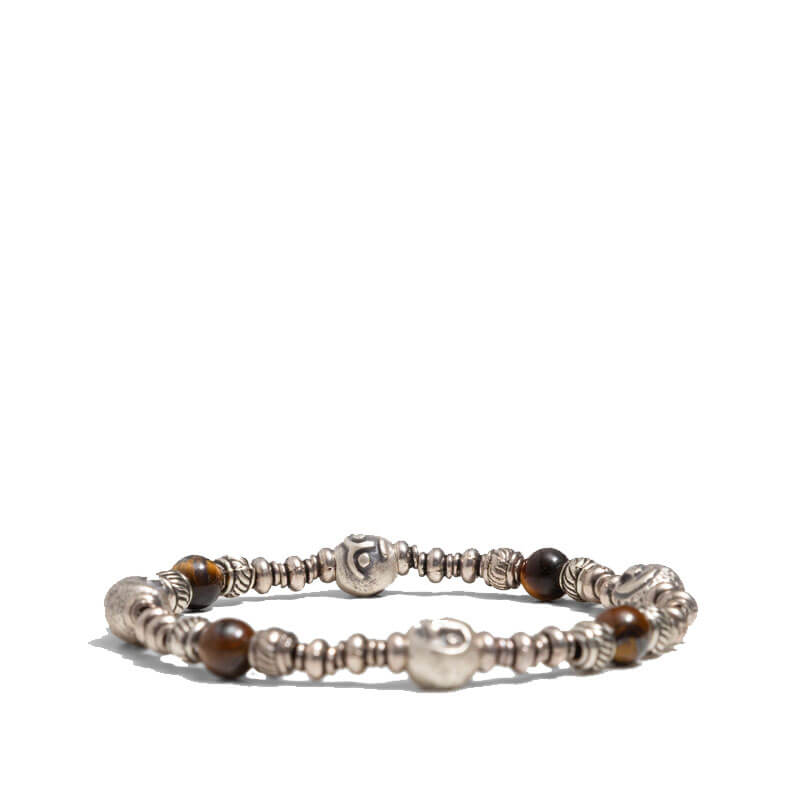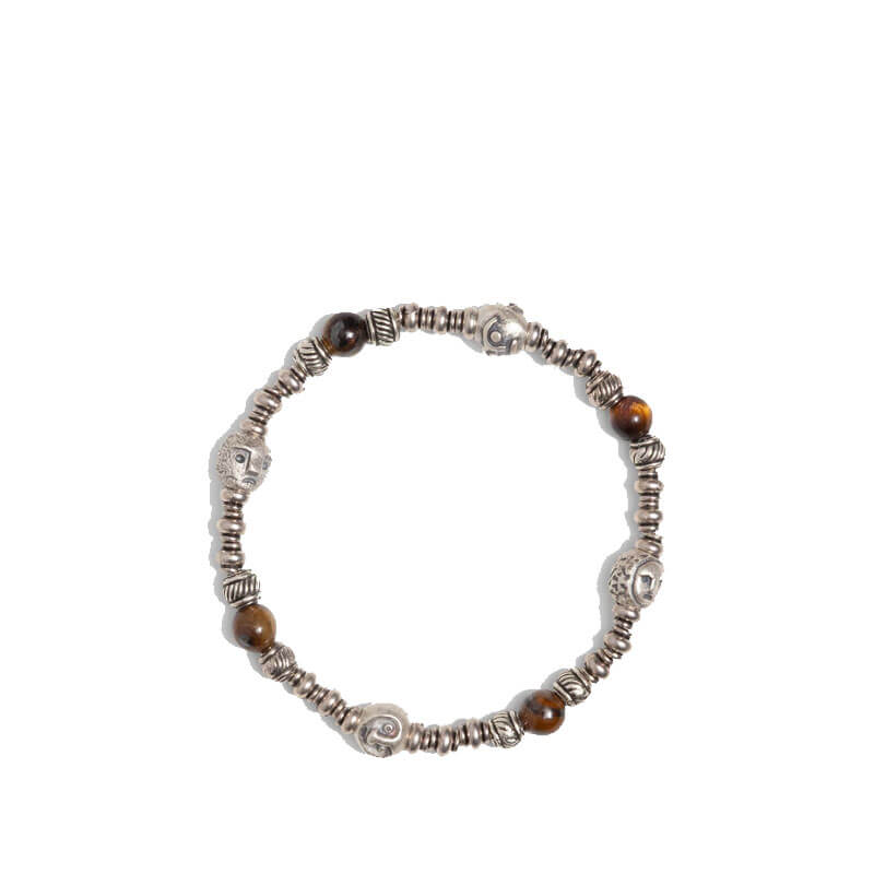 HERESY Godhead Bracelet – Silver: Bracelet featuring 4 heads in 925 silver, tigers eye round beads and antique silver spacer beads, the bracelet is elasticated and comes in one size.