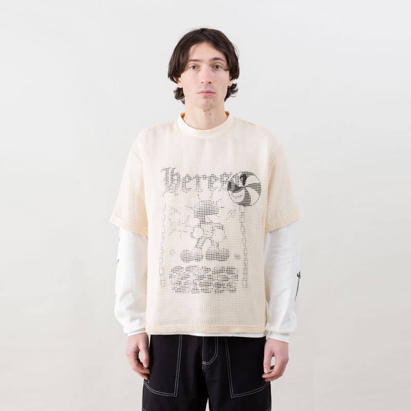 Dominic Owen and Jasper Dunk founded HERESY in 2012, in Peckham, London. Now, based on South England, HERESY produces seasonal clothing collections heavily influenced by the research and exploration of Folklore. Since the start of the company, HERESY has been operating in an ethically conscious manner. Their garments feature bold graphics and illustrations, core to the brand’s visual identity, including hand-drawn sketches, airbrushed visuals, and mosaic-like collages. As well as clothing they make handmade art objects, produce events, program music projects, and print small-press publications.