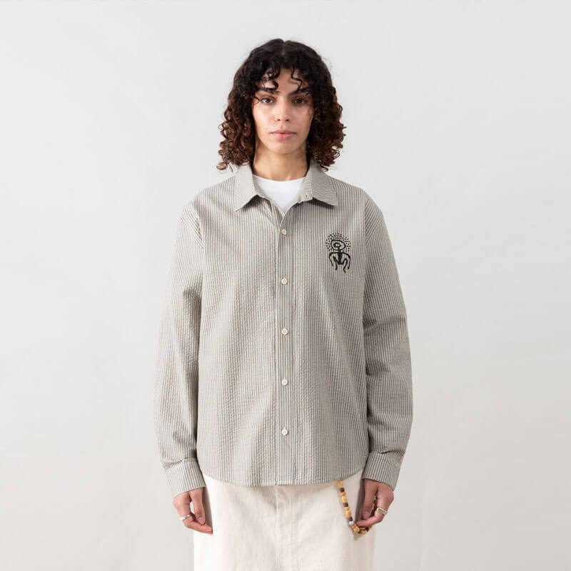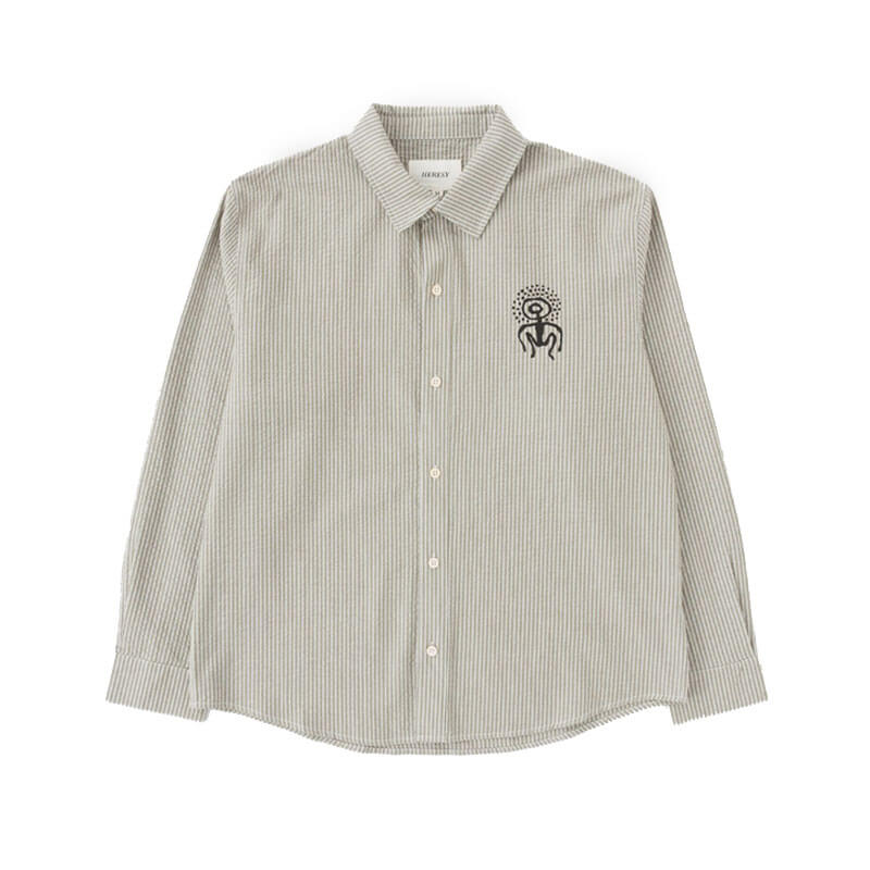 Dominic Owen and Jasper Dunk founded HERESY in 2012, in Peckham, London. Now, based on South England, HERESY produces seasonal clothing collections heavily influenced by the research and exploration of Folklore. Since the start of the company, HERESY has been operating in an ethically conscious manner. Their garments feature bold graphics and illustrations, core to the brand’s visual identity, including hand-drawn sketches, airbrushed visuals, and mosaic-like collages. As well as clothing they make handmade art objects, produce events, program music projects, and print small-press publications.
