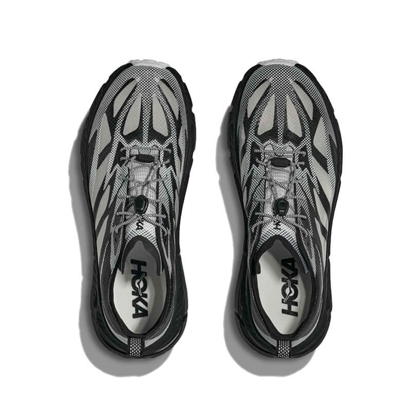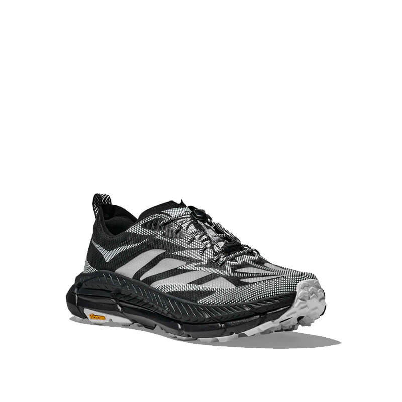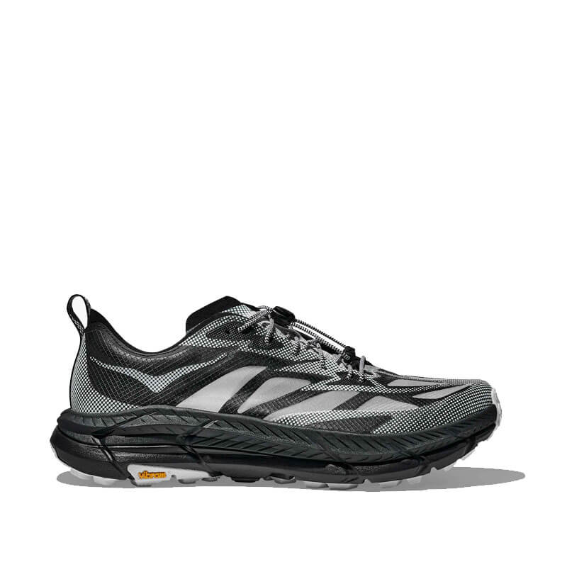 HOKA Stealth/Tech Mafate Speed 4 Lite – Black / White: Be seen. The Mafate Speed 4 Lite weaves together iridescent, translucent and reflective materials for this season’s Stealth/Tech collection. With futuristic features to match its high-tech looks —including a ProFly™ + midsole and Vibram® Megagrip with Litebase outsole—this street-ready style plays with the idea of performance and visibility.