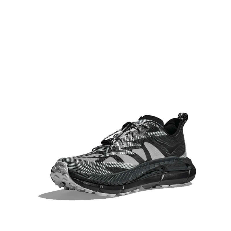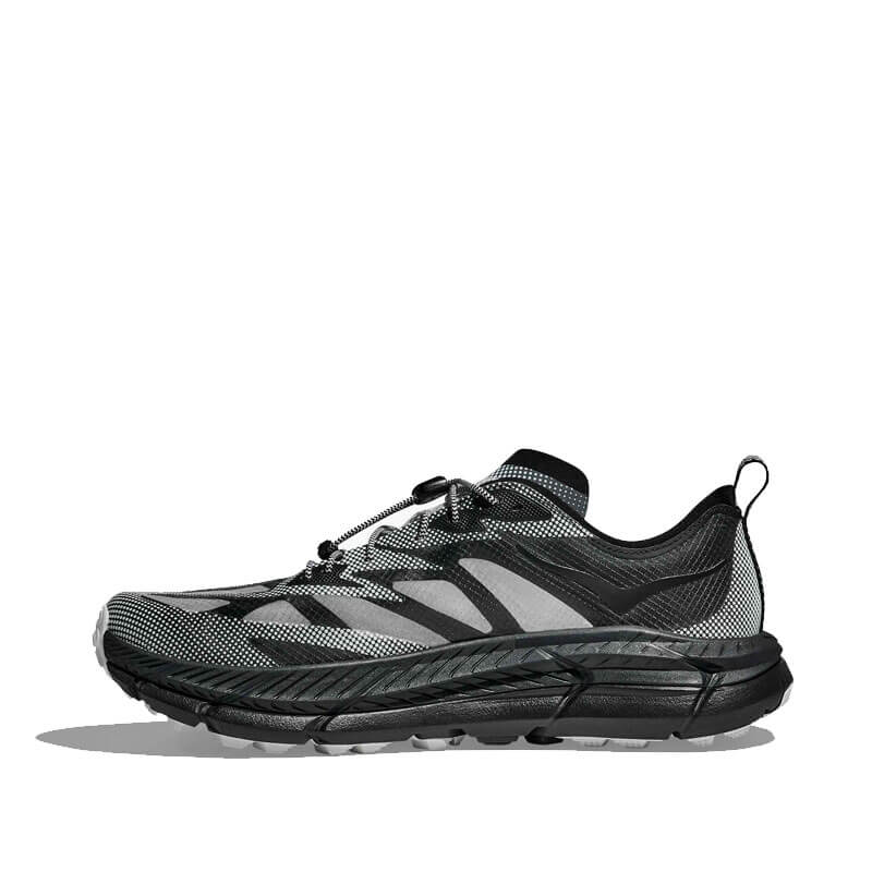 Delivered for the first time for Fall25, this HOKA Stealth/Tech Mafate Speed 4 Lite – Black / White features: