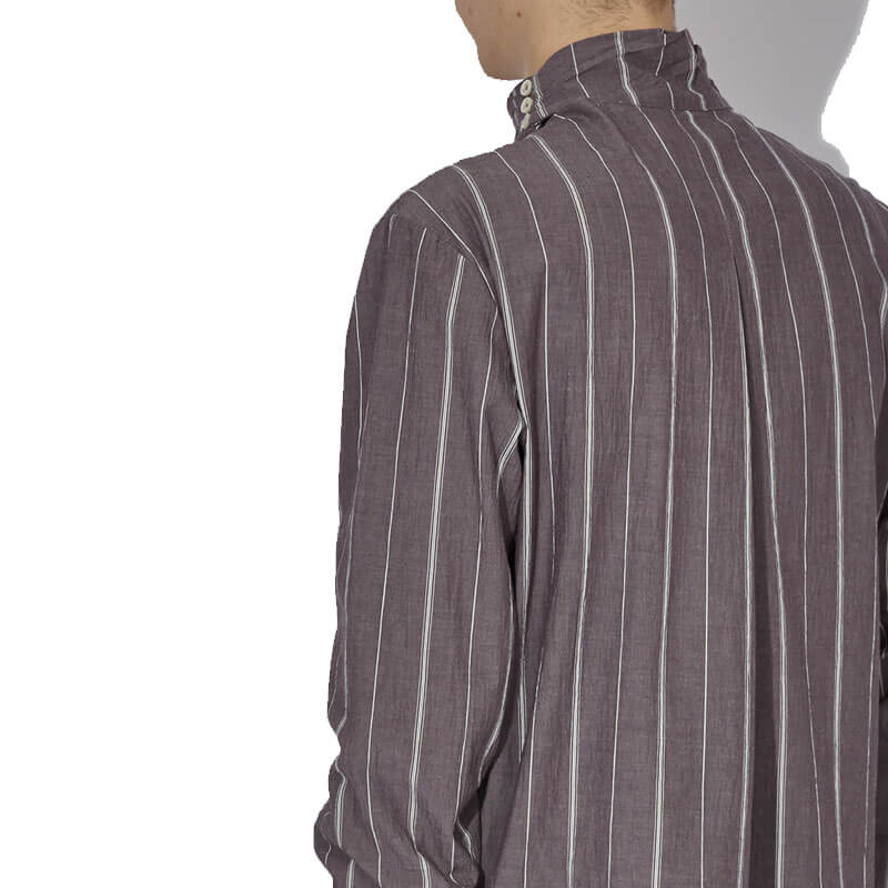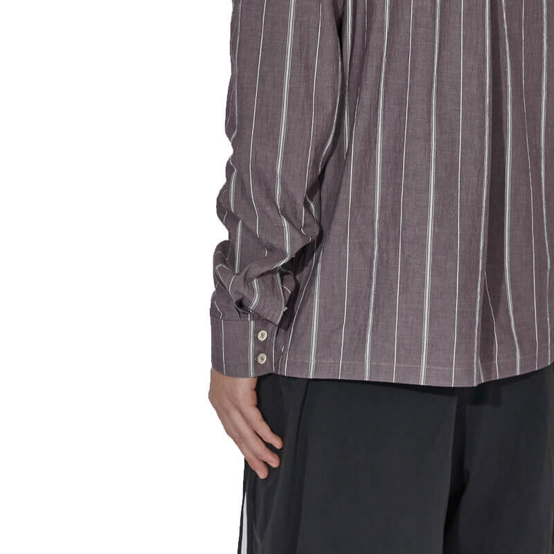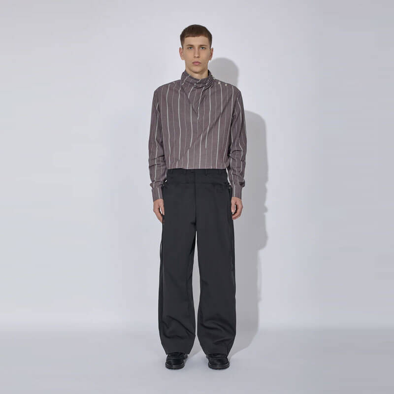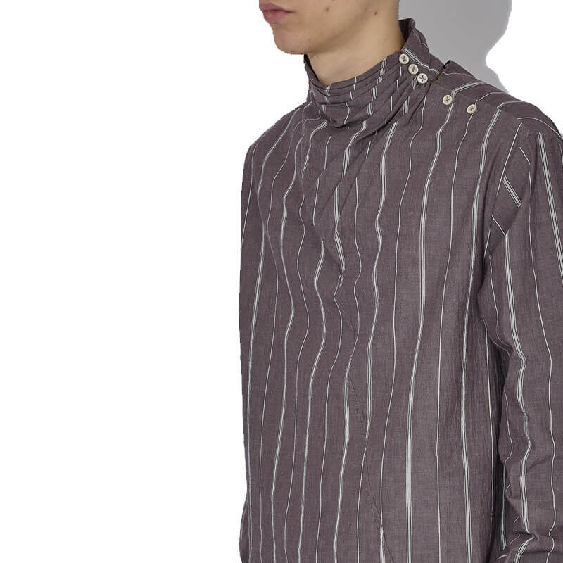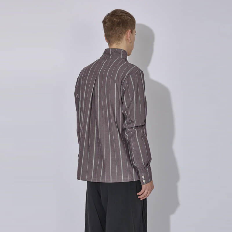 _J.L-A.L_ Dorment Shirt – Burnt Maple: The Dorment Shirt features a pleated wrap collar with an asymmetric button placket, elevating the design with subtle complexity. Available in a seasonal cotton stripe fabric, the shirt merges classic shirting techniques with modern construction.