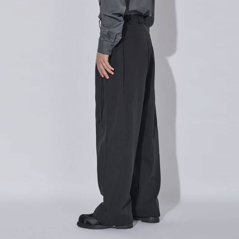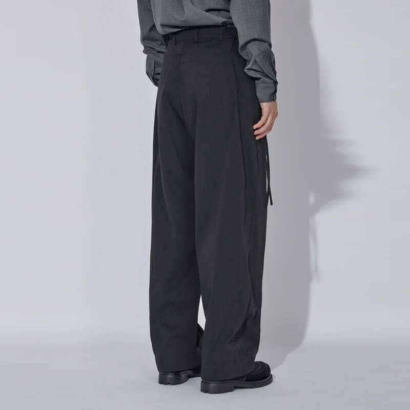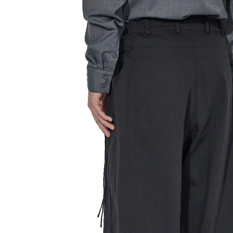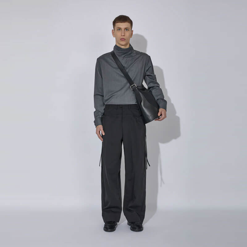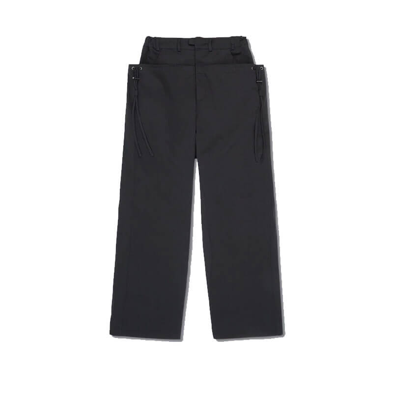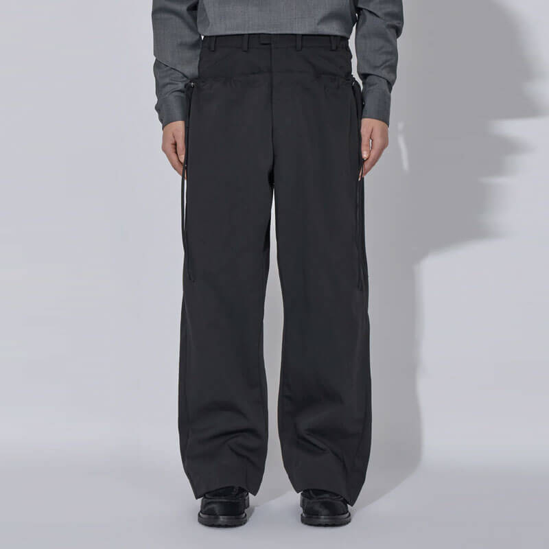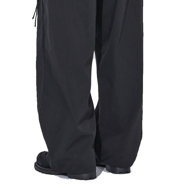 _J.L-A.L_ Pistula Trouser – Shungite Black: The Pistula Trousers are constructed from 100% nylon, with side-entry pockets concealed beneath a secondary layer that can be cinched with drawcords, allowing for an adjustable, baggy silhouette. The cinching mechanism introduces versatility in the fit, creating a dynamic and adaptable shape.