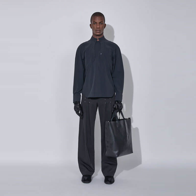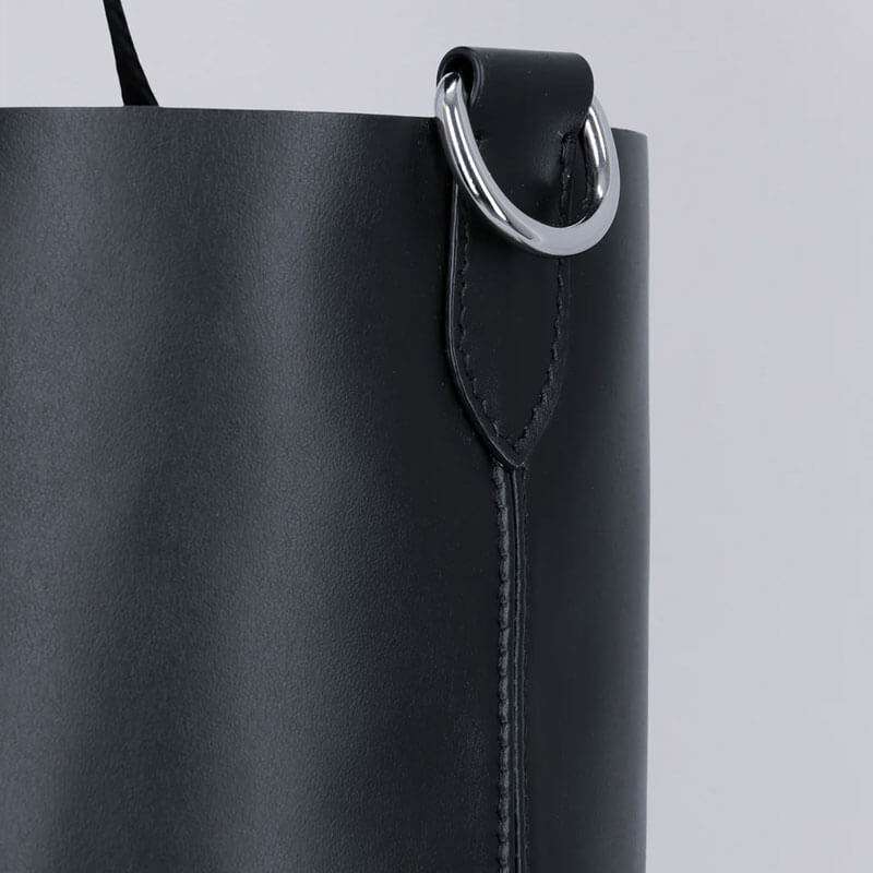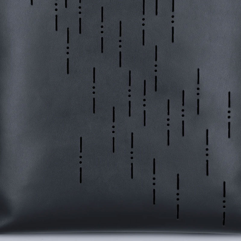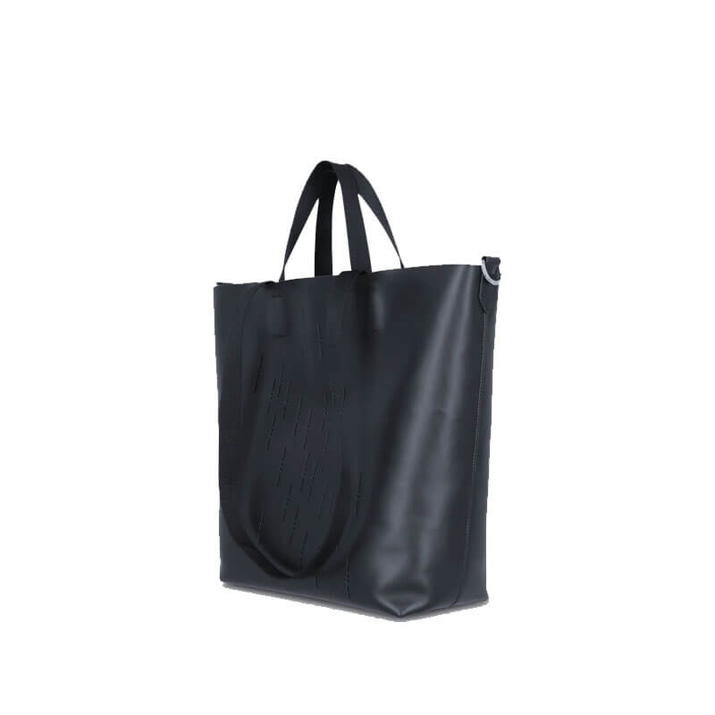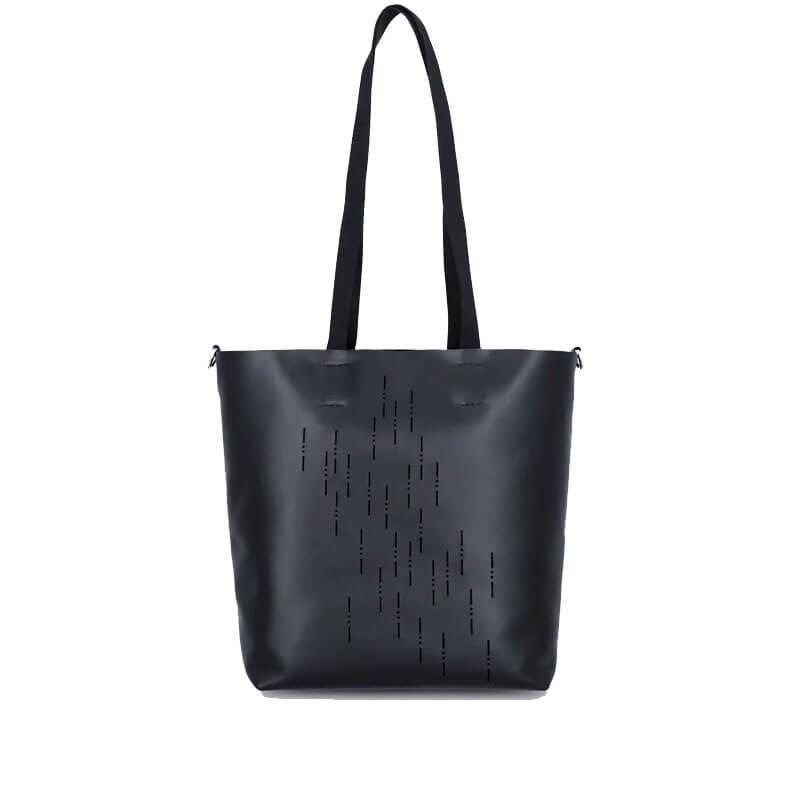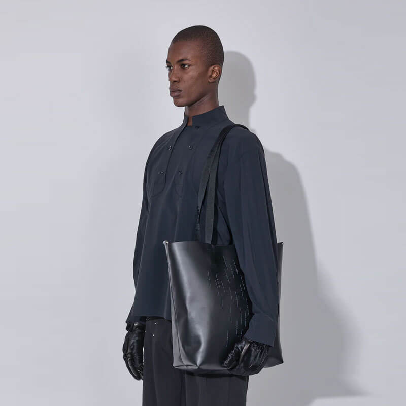 _J.L-A.L_ Topor Tote – Shungite Black: The Topor Tote is crafted from clean calf leather, featuring a dispersed laser-cut logo perforation across it’s structured silhouette. Two strap length options are integrated for versatile styling.