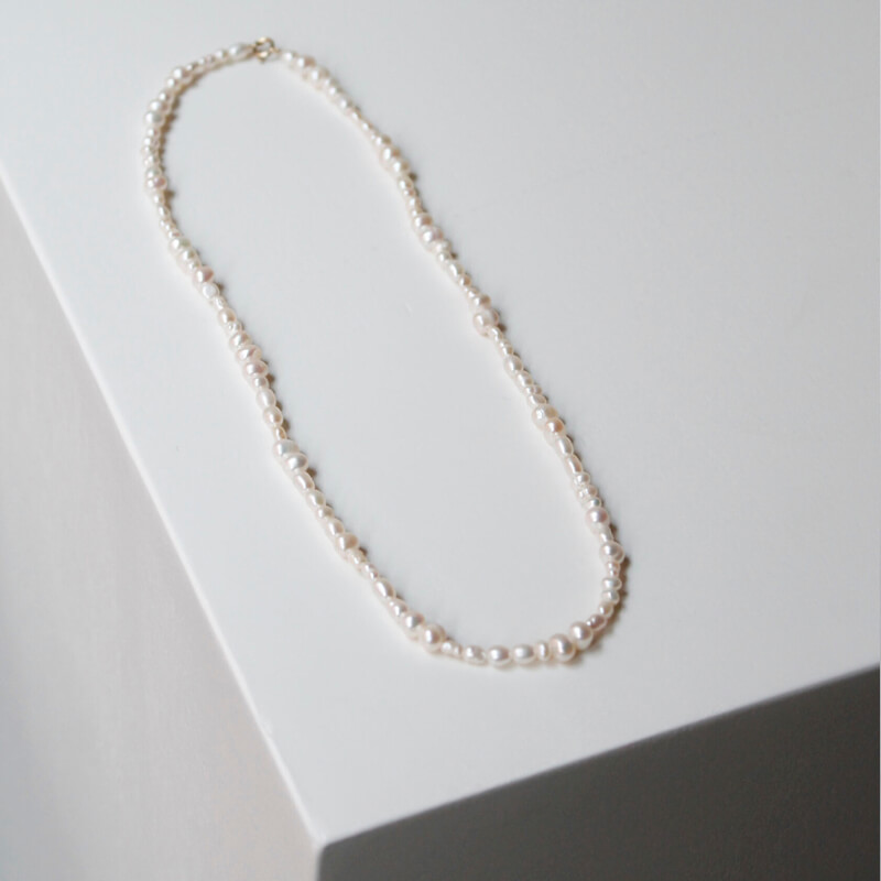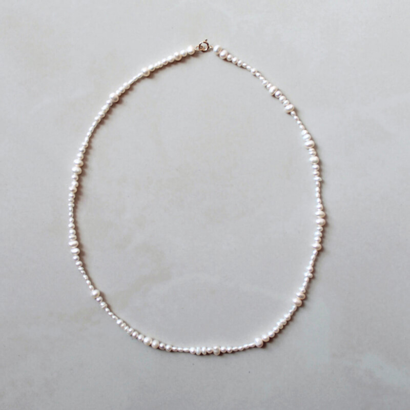 LABRO Piccolo Pearl Necklace – White: The design of the Piccolo Pearl necklace grew from the idea of re-using leftover pearls into a playful necklace. Various sizes and qualities of pearls come together in this classic design. Perfect for both casual daytime and more dressed-up occasions. This handmade necklace features: