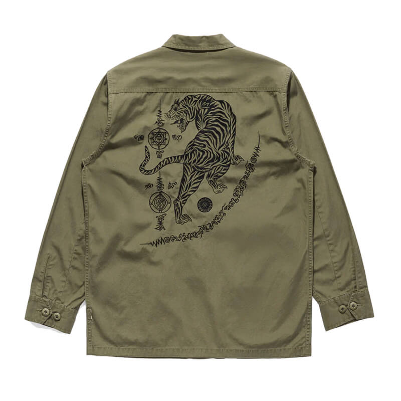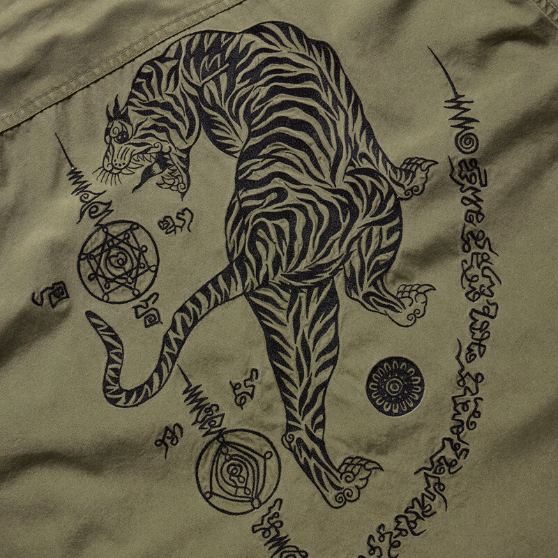 MAHARISHI Sak Yant Jungle Overshirt – Olive: Olive overshirt, cut from a repro ’60s cotton poplin commonly seen on U.S. Army fatigues. Buttoned front closure and cuffs, with secure flap patch pockets on chest and hem. Hand-machined embroidered Yantras decorate the back and front by guest artist: Amorn Settihorn for Maharishi. Included in the last Spring-Summer23 collection, this MAHARISHI Sak Yant Jungle Overshirt – Olive features: