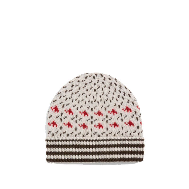MAMMUT x NIGEL CABOURN Direttissima Beanie – White Stone: Knitted in one of the world’s finest mills in Scotland, this beanie is crafted from wool, a material used by alpinists in the sixties for outerwear insulation thanks to its reliable warmth. The fully fashioned construction, vintageinspired jacquard mammoth motif and striped cuffs pay tribute to garments of the time.