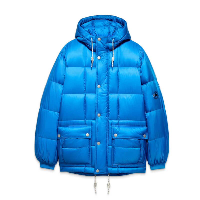MAMMUT x NIGEL CABOURN Direttissima IN Hooded Jacket – Valley Blue: This heritage jacket was created in collaboration with the British cult designer Nigel Cabourn. Inspired by the 1969 first ascent of the Japanese Direttissima route on the Eiger, the design is based on an original puffer from the period. The outer shell is crafted from durable Pertex® Quantum fabric – a lighter, modern version of the original downproof fabric used for expedition clothing. The vintage look is complemented by an embroidered Mammut Garantie logo, two patch flap pockets and a fleece-lined side entry pocket.