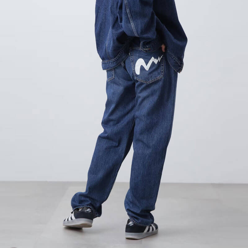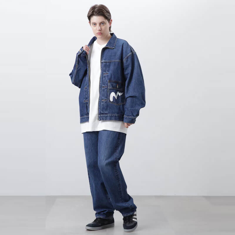 MANASTASH MS Denim Skater Pant – Used: 12.75oz made in Japan denim pant. Reconstructed with the essence of 90’s street style, it presents a wide silhouette that captures the spirit of those time. The pattern features a significantly widened crotch angle compared to regular jeans, enhancing the range of leg movement and accommodating activities like skateboarding, biking,etc. The elastic waist ensures stress-free and comfortable fit, completing the authentic feel of the 90’s street silhouette. Features include Talon zippers, a paint logo, donut buttons, a suede patch, and a pis label. Overlock thread in Manastash Green.
