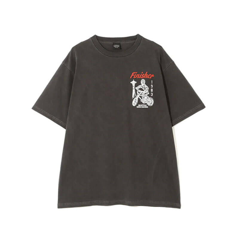 MANASTASH Pumice BMX Tee – Black: A heavyweight cotton T-shirt with a pigment dye, distressed finish, and a dry touch texture, giving it a vintage look. Featuring graphic inspired by the T-shirts given to participants in the BMX competition held in Seattle in 1983.
