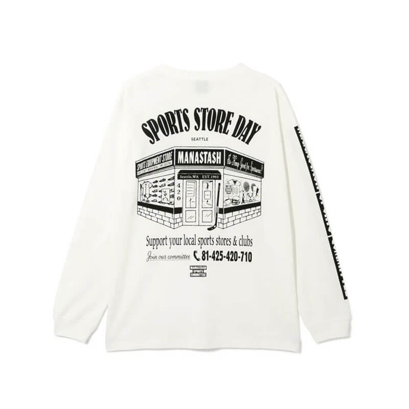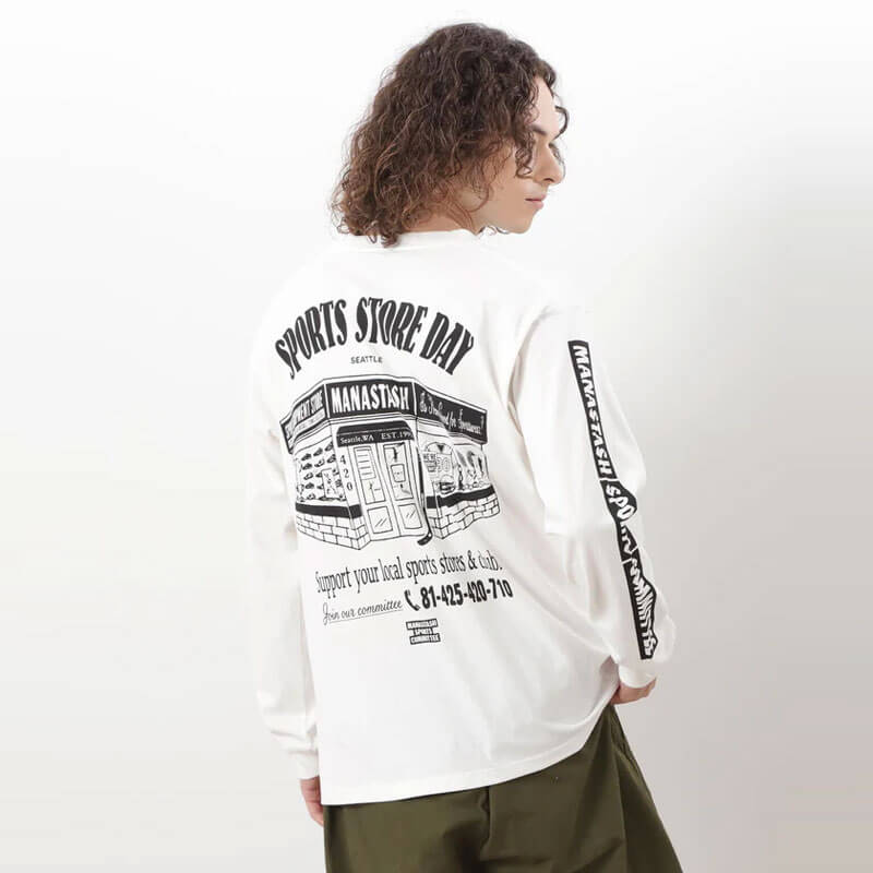 MANASTASH SSD LS CiTee – White: CiTee series from Manastash. Crafted in a 7.3oz heavyweight cotton, this classic longsleeve tee has a slight rough texture. It absorbs sweat and dries quickly. The screen-printed graphic on the chest, back and sleeves complete the design.