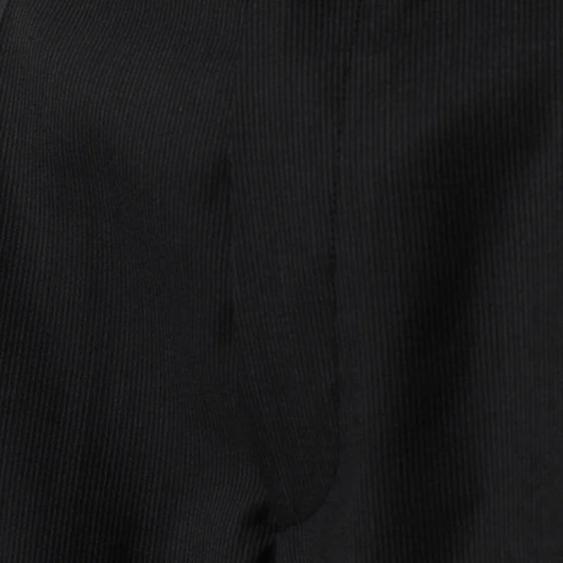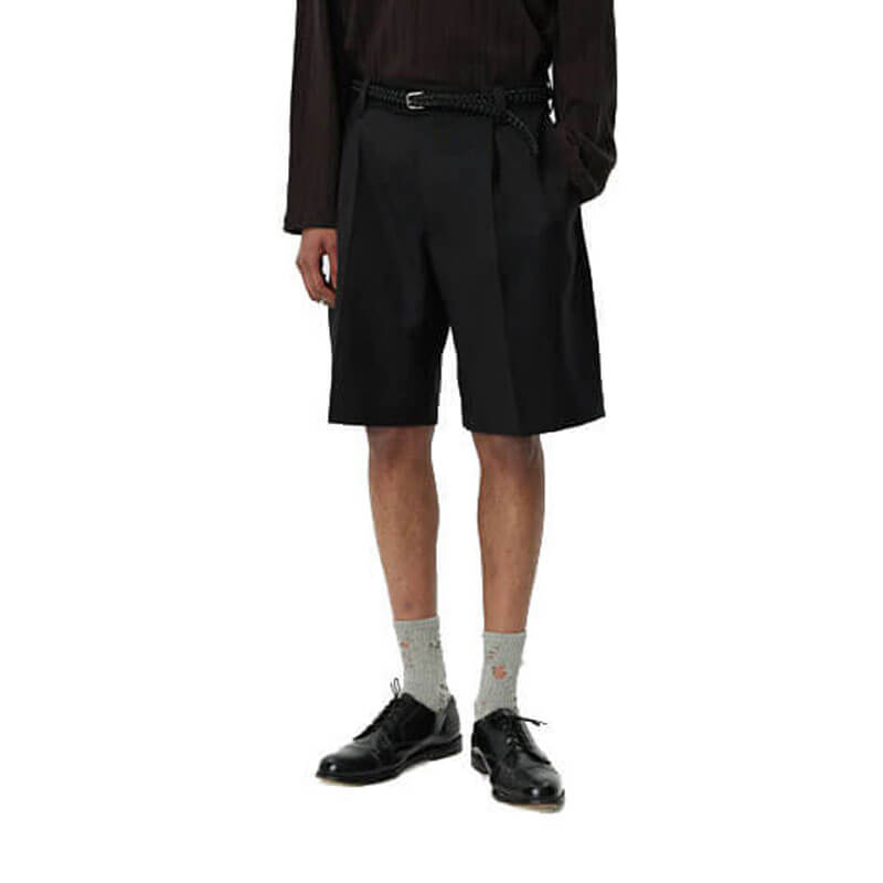 MFPEN Classic Shorts – Fine Black Stripe: The Classic Shorts have a relaxed fit with single pleats and a mid-rise. Made with side pockets, rear patch pockets, button fastening, YKK zip fly and raw edges details. Cut from a deadstock Italian wool with a fine dark grey stripe on a black ground.