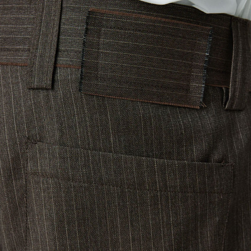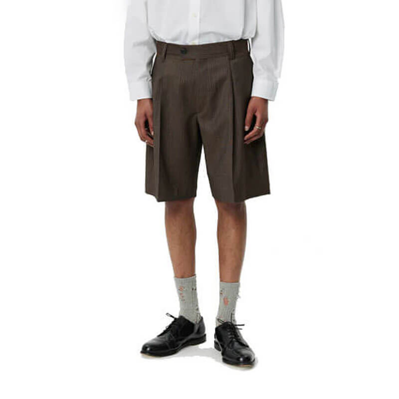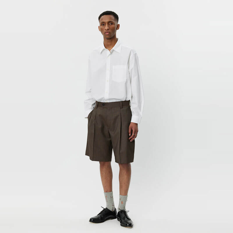 MFPEN Classic Shorts – Nutmeg Vintage Stripe: The Classic Shorts have a relaxed fit with single pleats and a mid-rise. Made with side pockets, rear patch pockets, button fastening, YKK zip fly and raw edges details. Cut from a deadstock Italian wool with a fine light grey pinstripe on a speckled brown ground.