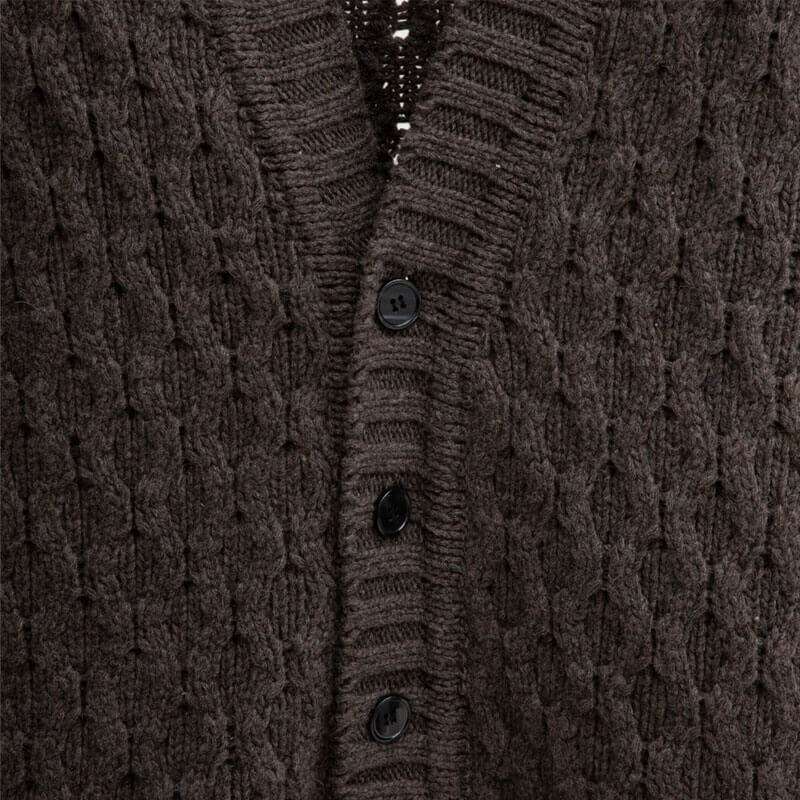 MFPEN Fence Cardigan – Brown: Boxy fit cardigan in cable knit crafted in recycled wool. This cardigan features four button placket with ribbed v-collar, cuffs and hem. Made from recycle wool yarn, by making this garment no new fabrics were produced. Included in MFPEN’s FW22 collection, this Fence Cardigan – Brown features: