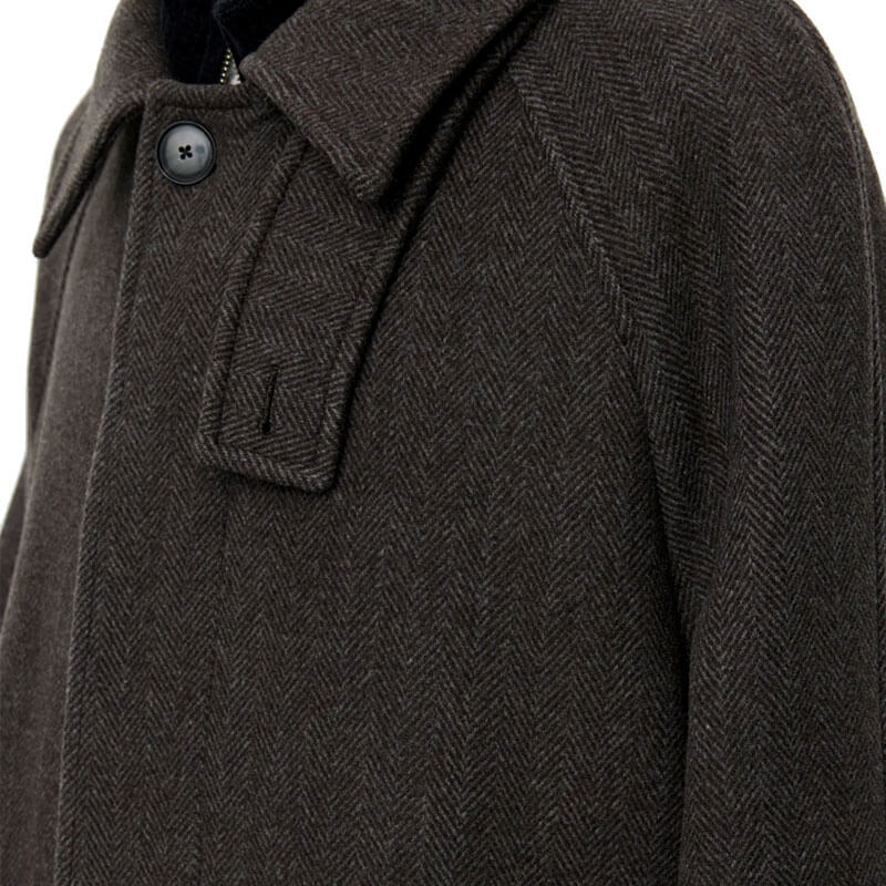 MFPEN Installation Coat – Brown Herringbone: The Installation Coat is calf length with an oversized fit and raglan sleeves. Made with hidden button closure, removable storm collar tab, side pockets and rear vent. Cut from post-consumer recycled melton wool in a grey brown herringbone.
