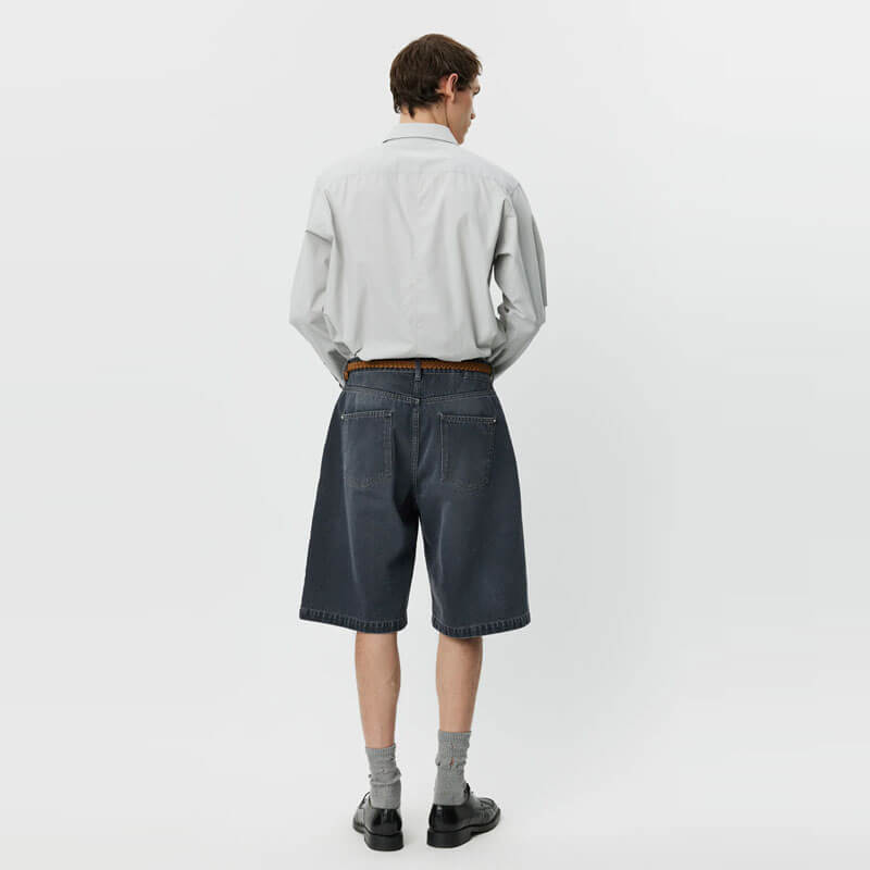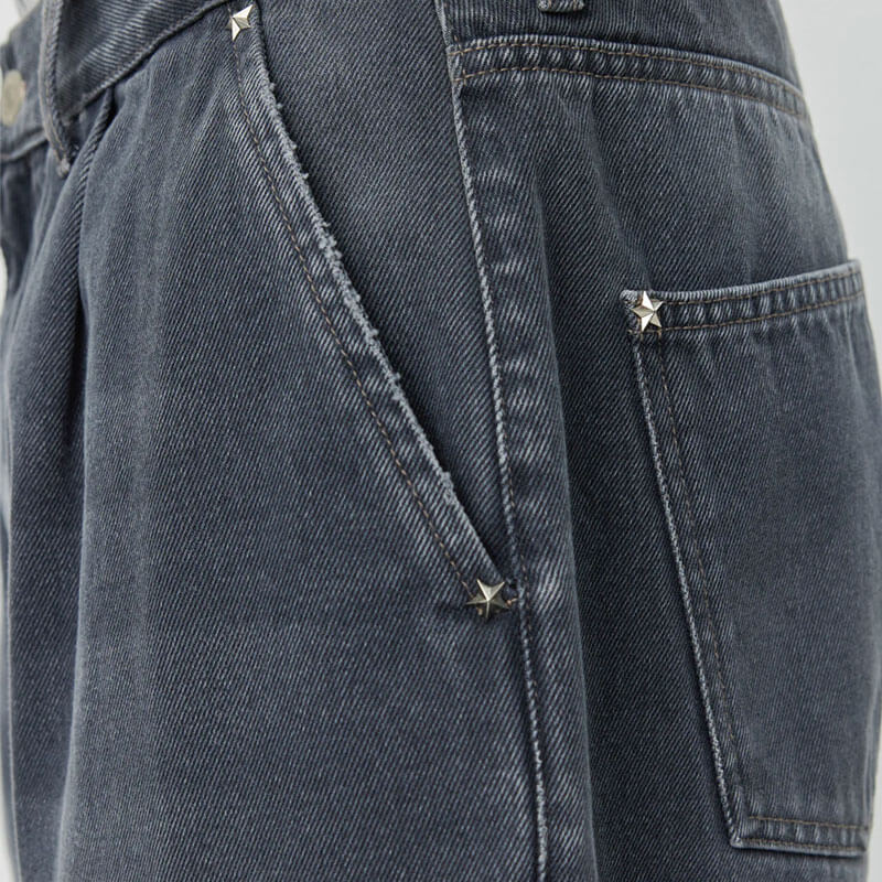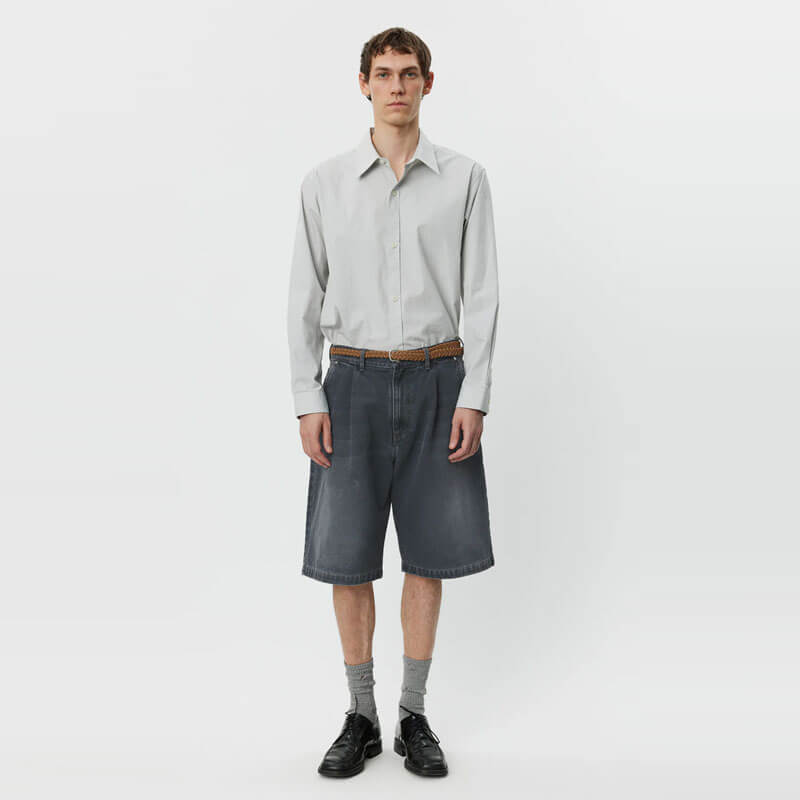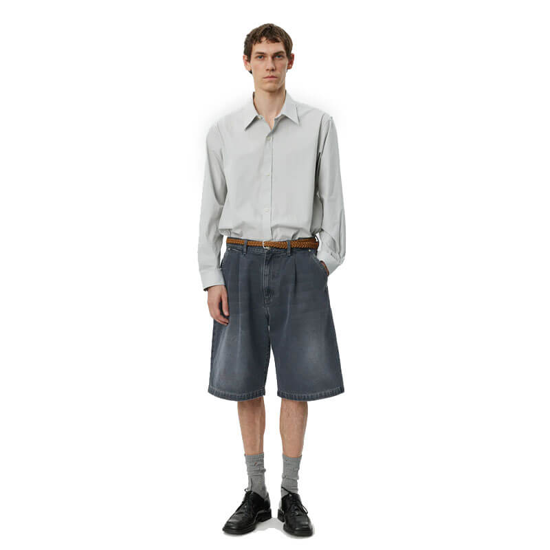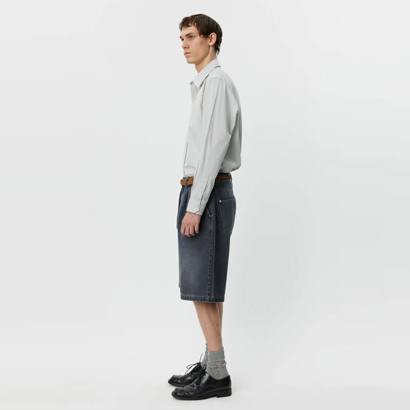 MFPEN Star Rivet Short – Slate: The Star Rivet Shorts have a relaxed straight fit with single pleats and a mid-rise. Made with side pockets and rear patch pockets with star rivets, metal button closure and YKK zip fly. Cut from a washed organic cotton denim twill, with color made from a cold dye.