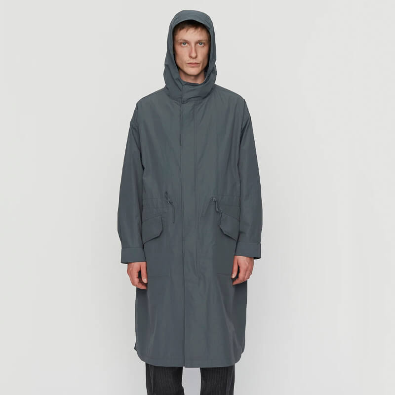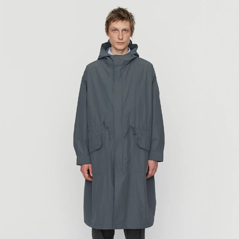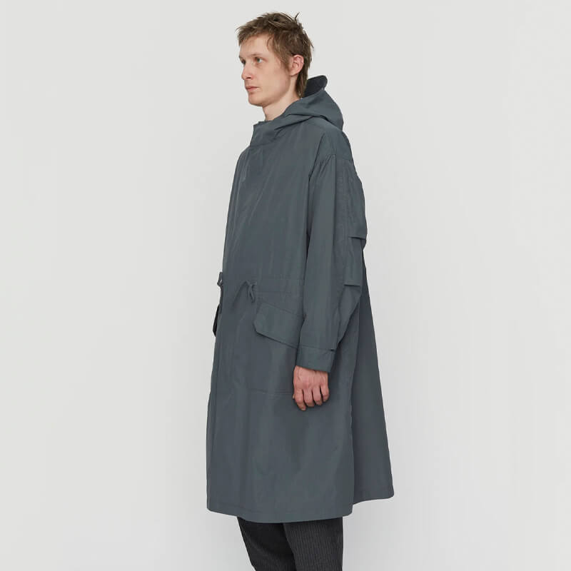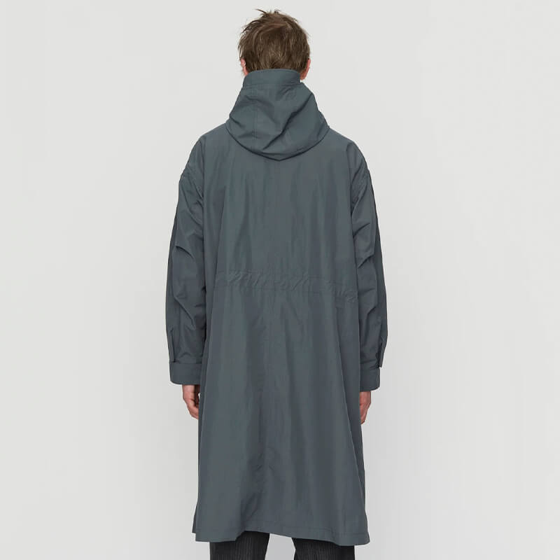 MFPEN Study Coat – Steel Grey: Long hooded parka-style coat. Cut from an unlined recycled polyamide and cotton blend with a slightly wrinkled effect. Made with pleats on the back sleeve, concealed front buttons and zipper, and features front pockets and ropes in the waist. Included in the latest SS23 collection, the Mfpen Study Coat – Steel Grey features: