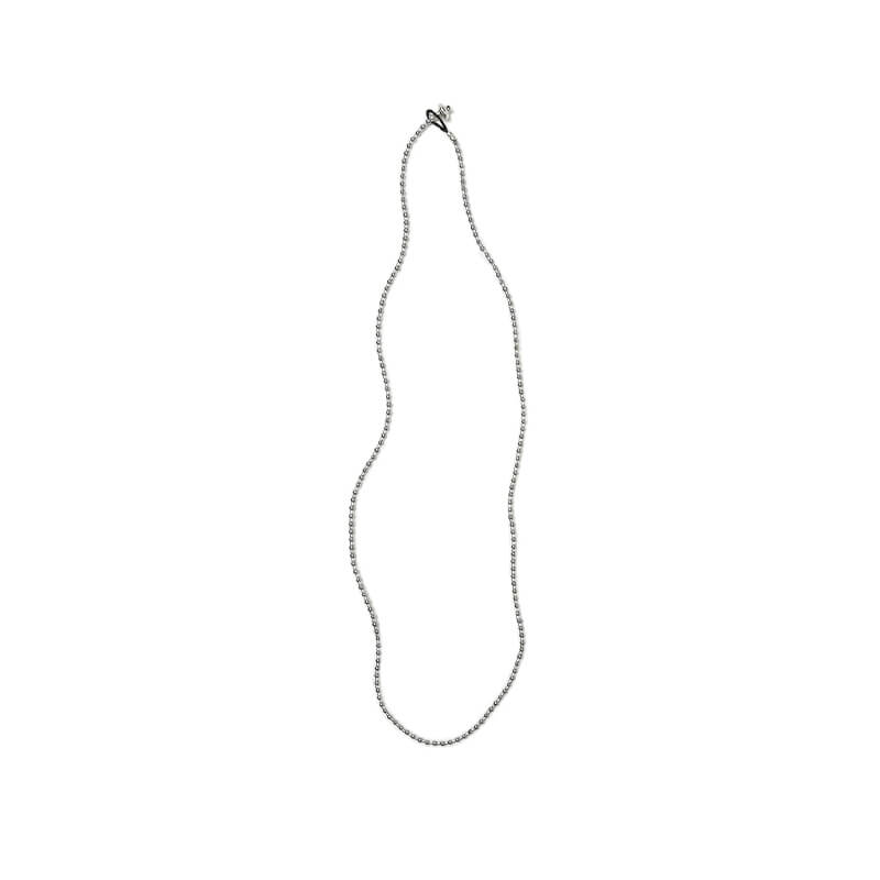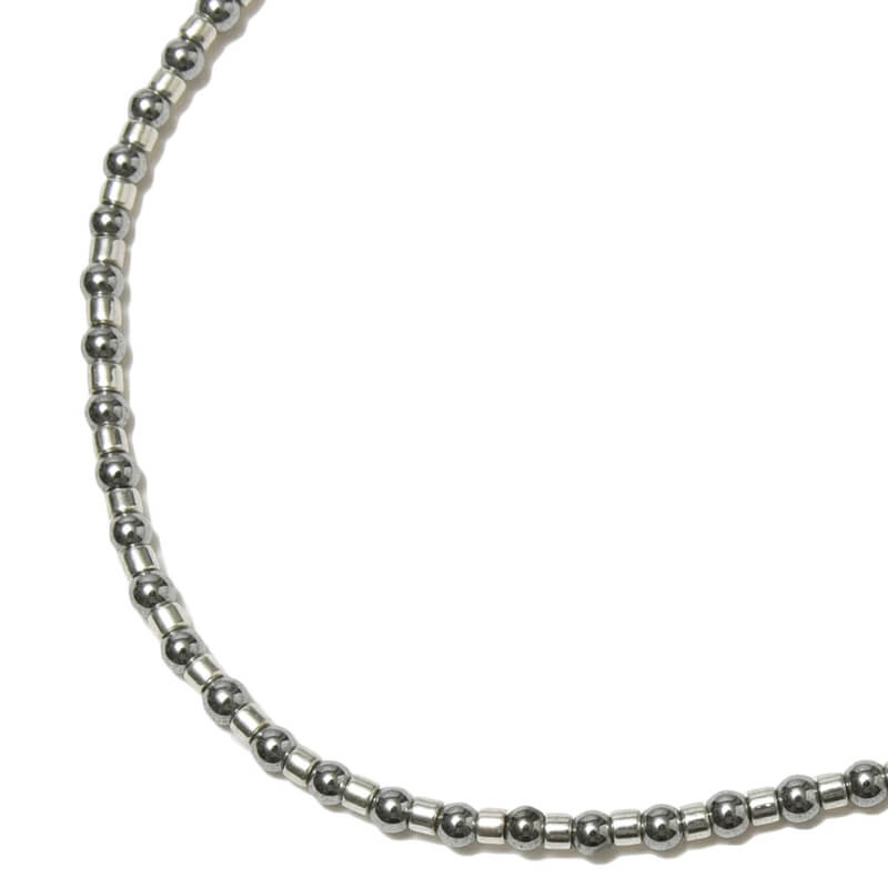 MIKIA 2mm Stone Necklace – Hematite / Silver: A beautiful silver round bead necklace that looks just like pearls. Crafted in Japan and accented with MIKIA’s original clasp. A hematite necklace that is said to be a stone that leads to victory. The simple design with only silver color gives a powerful impression.