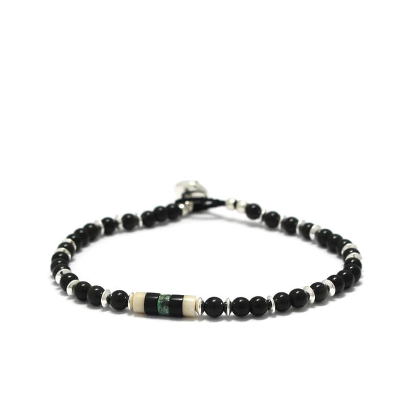 MIKIA 4mm Stone Heishi Bracelet – Rainbow Obsidian: This bracelet has a black obsidian that looks iridescent depending on the angle of the light, and a black jet through the center that gives it a chic look. Crafted in Japan and using Mikia original clasps with engravings.