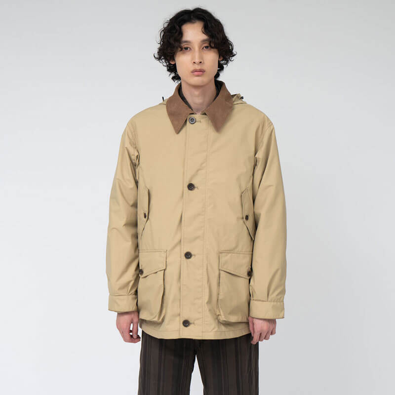 NANAMICA 2L PERTEX UNLIMITED Field Jacket – Beige: Field jacket designed based on British hunting jackets. Utilizes 2-layer PERTEX®︎ UNLIMITED with excellent waterproof, breathability, and durable water repellent finish for the outer fabric that is made of nylon taffeta with a matte finish resembling cotton. Lined with house check pattern cotton / COOLMAX®, this garments features throat tab for wind protection on the collar and included detachable hood. Left chest and right waist flap pockets with zipper security pockets on the inside completes the design.