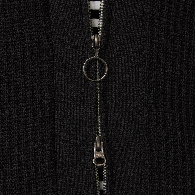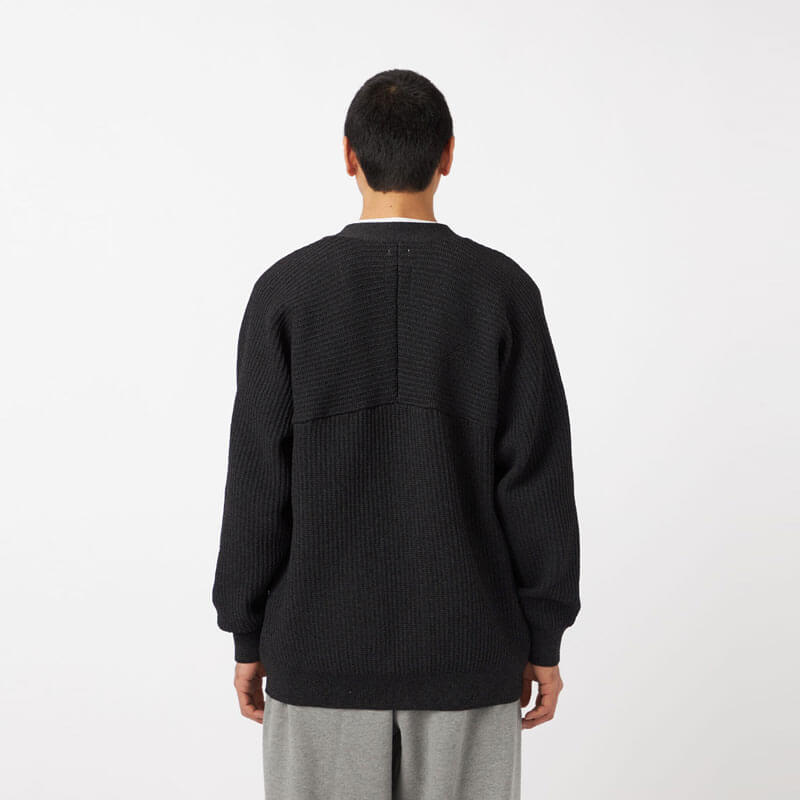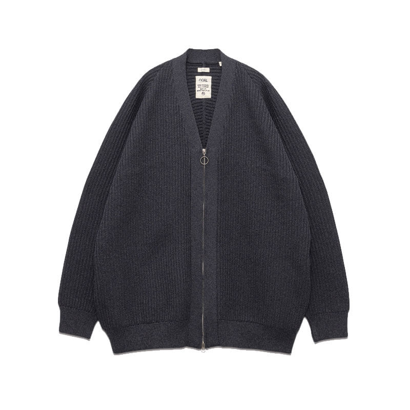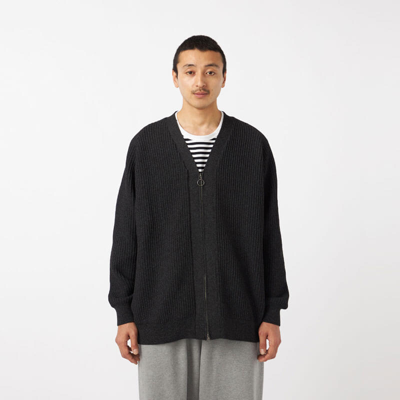 NANAMICA 5G Zip Cardigan – Heather Gray: This zip-up cardigan features raglan sleeves at the front and yoked sleeves at the back to enhance shoulder mobility and overall comfort. Knitted from recycled polyester yarn, it has a soft, voluminous texture that fits gently against the body. Simply throwing it on softens even a solid denim-on-denim look into something effortlessly relaxed.