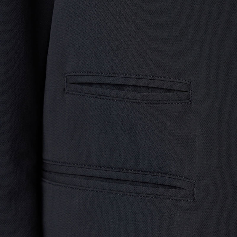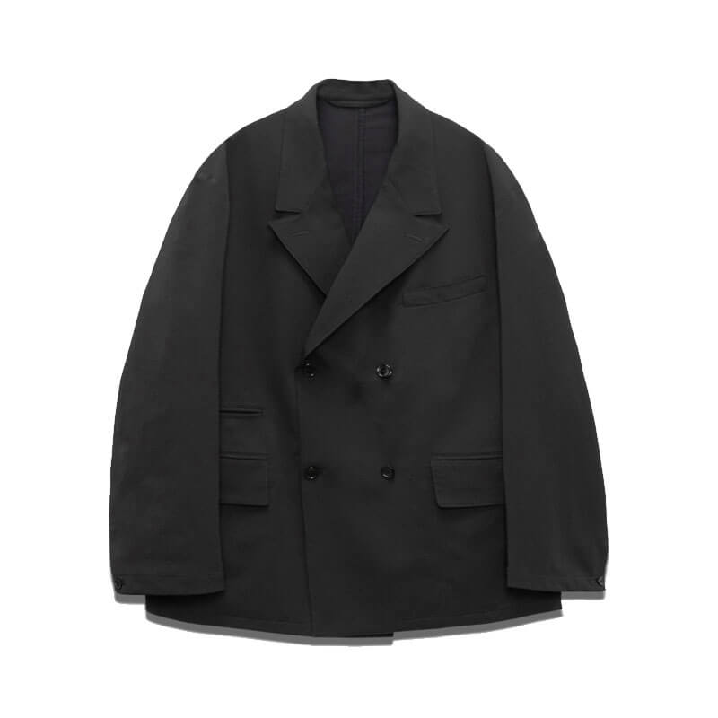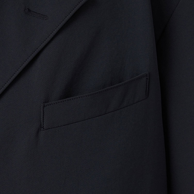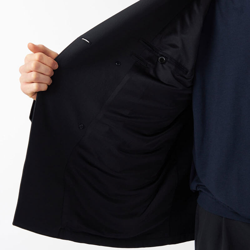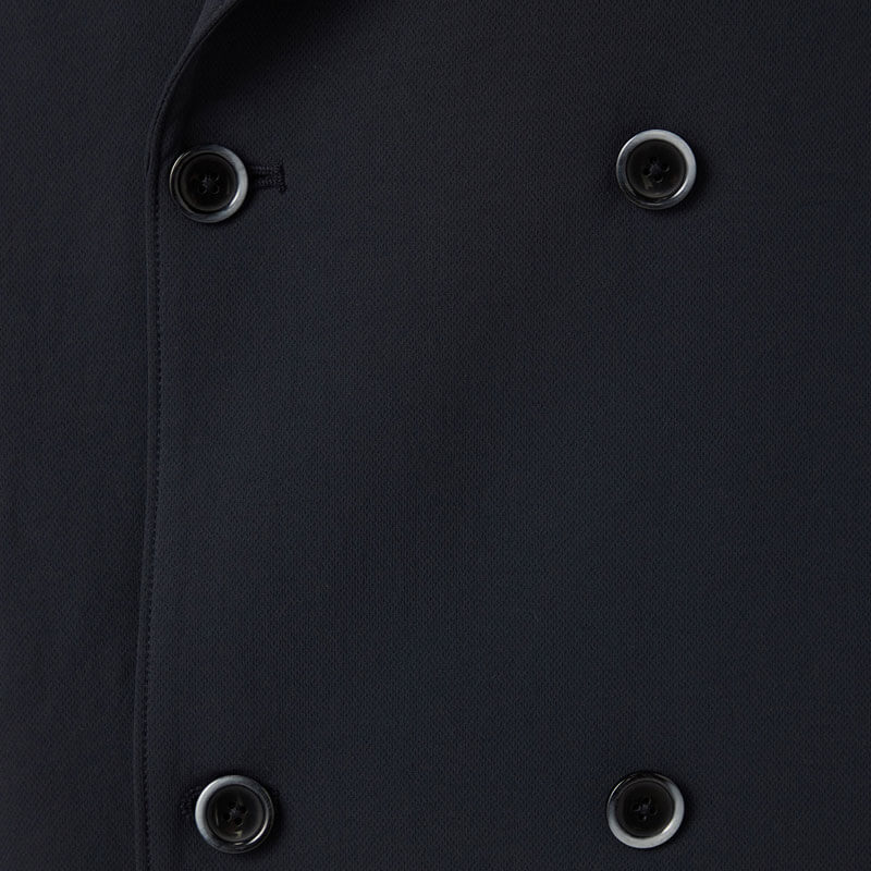 NANAMICA ALPHADRY Club Jacket – Black: Four-button double-breasted jacket made with ALPHADRY®, featuring excellent moisture-wicking, quick-drying, and stretch properties.