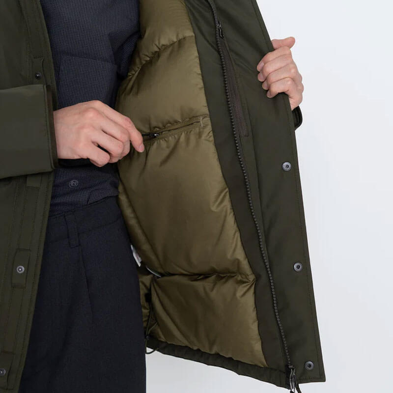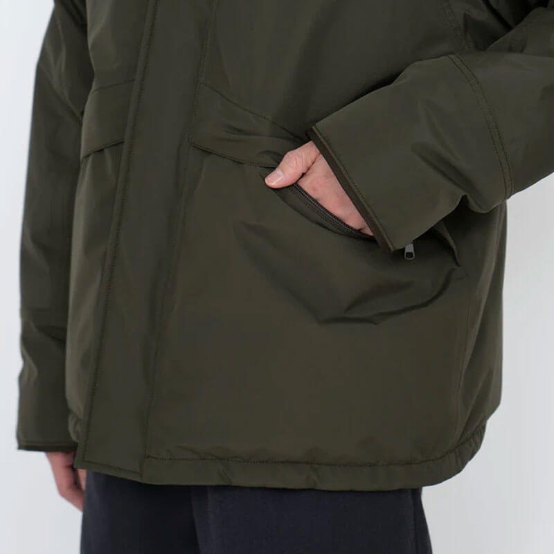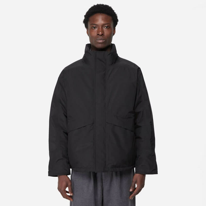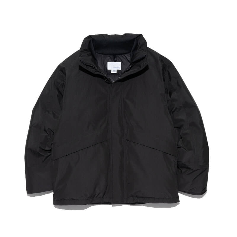 NANAMICA GORE-TEX Short Down Jacket – Black: Stand collar down jacket in a short length. Crafted in a waterproof and breathable 2L Polyester GORE-TEX Fabric and full lined in polyester ripstop. Featuring full zipped closure with plaket and dot buttons and yoke sleeves like on mountain jackets enables easy up and down movement of the arms. Inner collar and cuffs with ribs that prevent the entry of cold air while its filling with high function KODENSHI®︎ down, which reflects back far infrared rays emitted by the body, will maintain you warmth. Two big frontal pockets and two inner pockets with fastener complete the design.