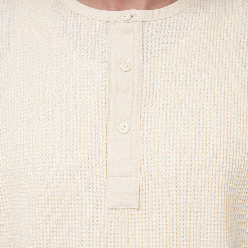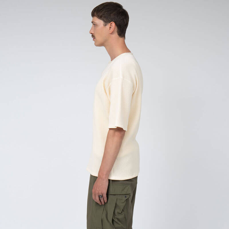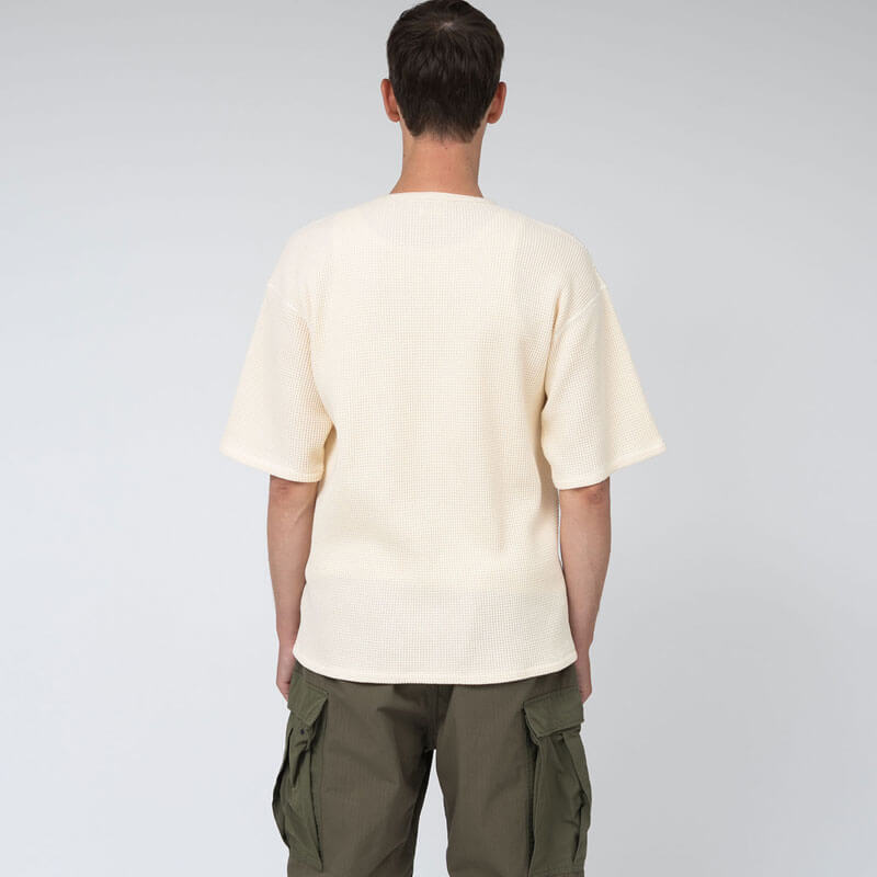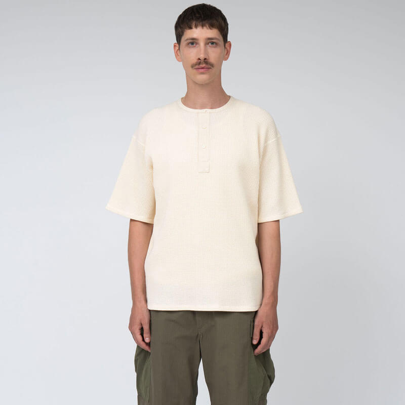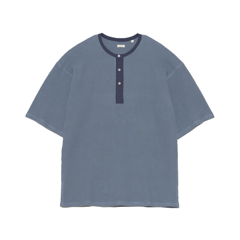 NANAMICA Henry Neck Thermal Sweat Tee – Blue Gray: Henley neck short sleeve thermal T-shirt in regular fit. Made from thermal fabric knitted with a covering core yarn of organic cotton and recycled polyester. Designed based on military undershirts, this garment features moderate thickness and a voluminous feel, with flat seams that reduce unevenness for a comfortable fit.