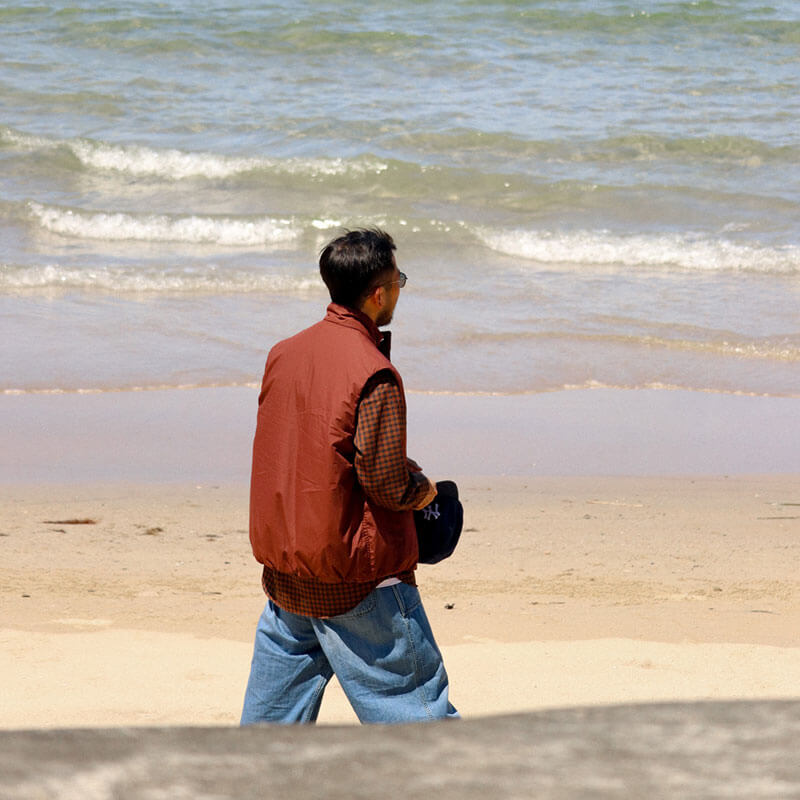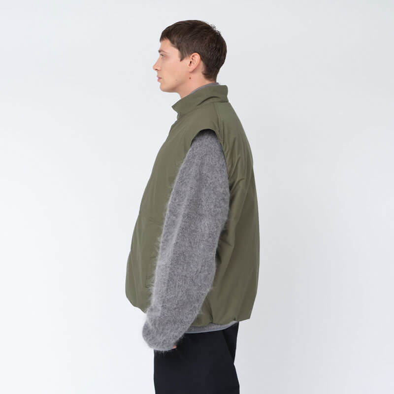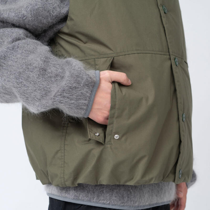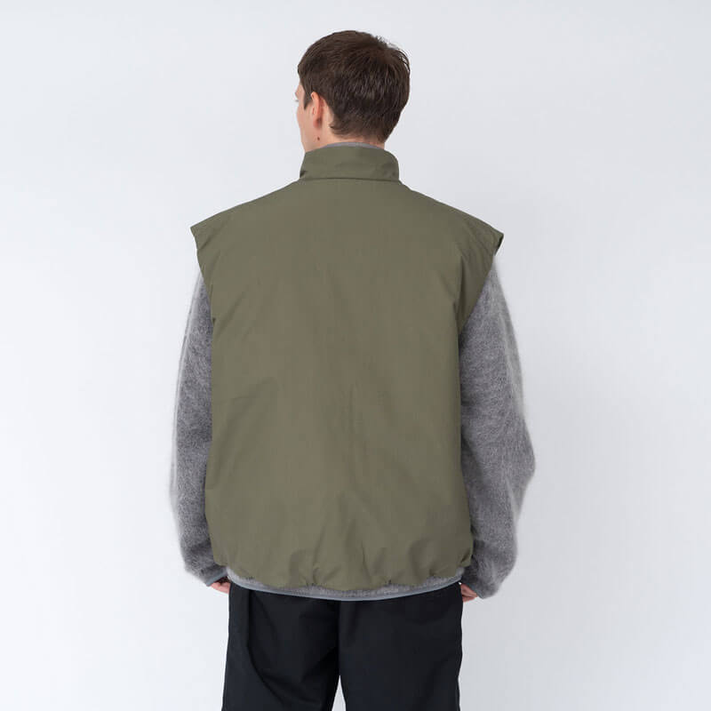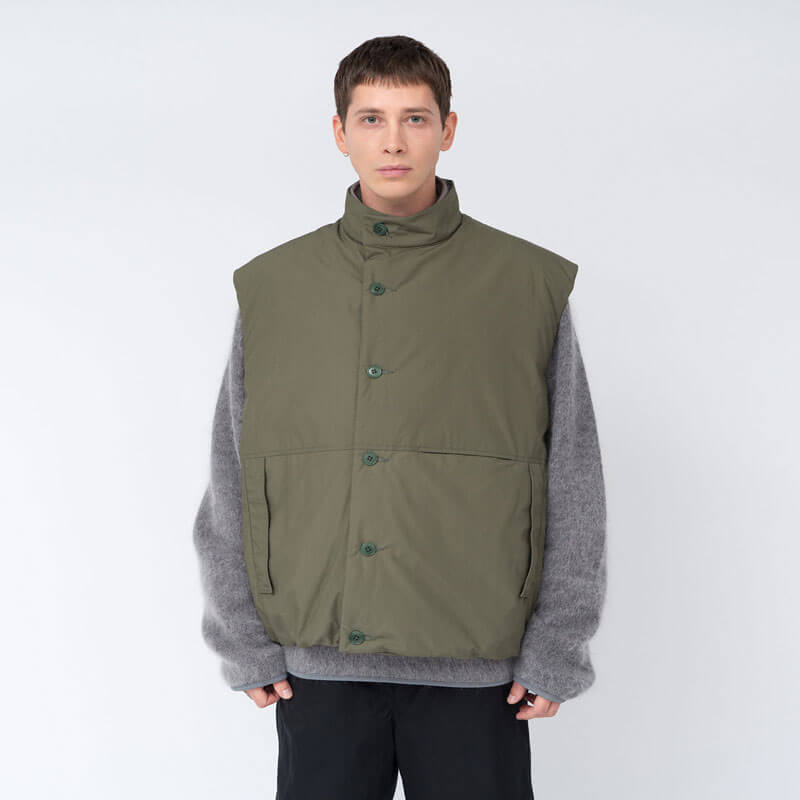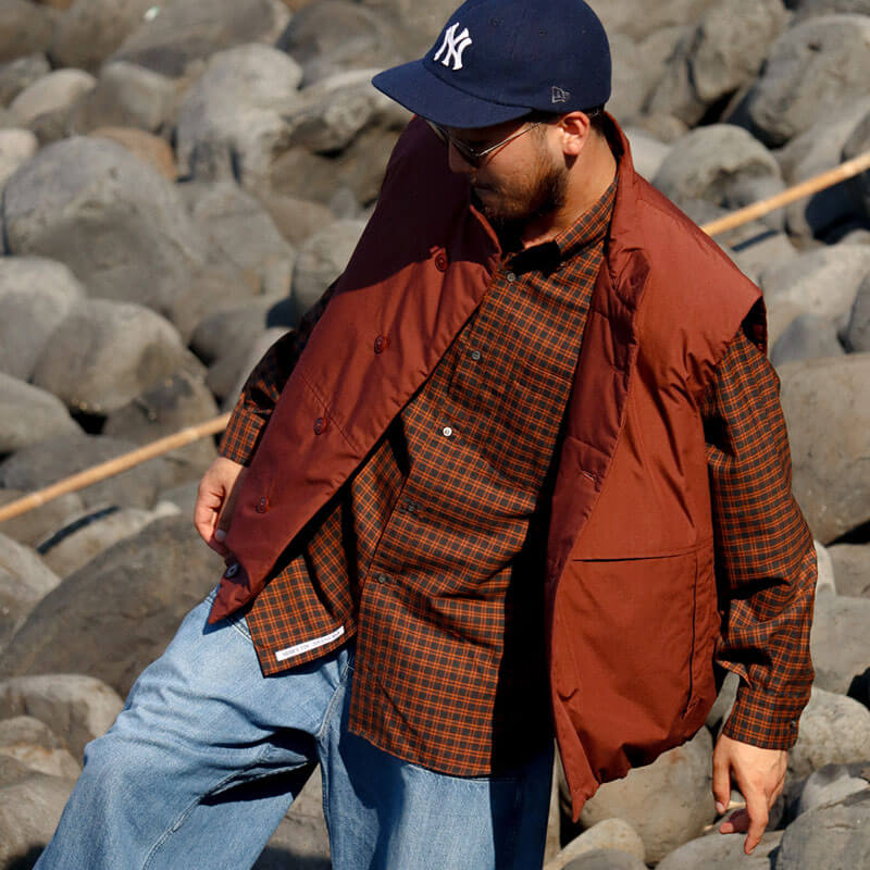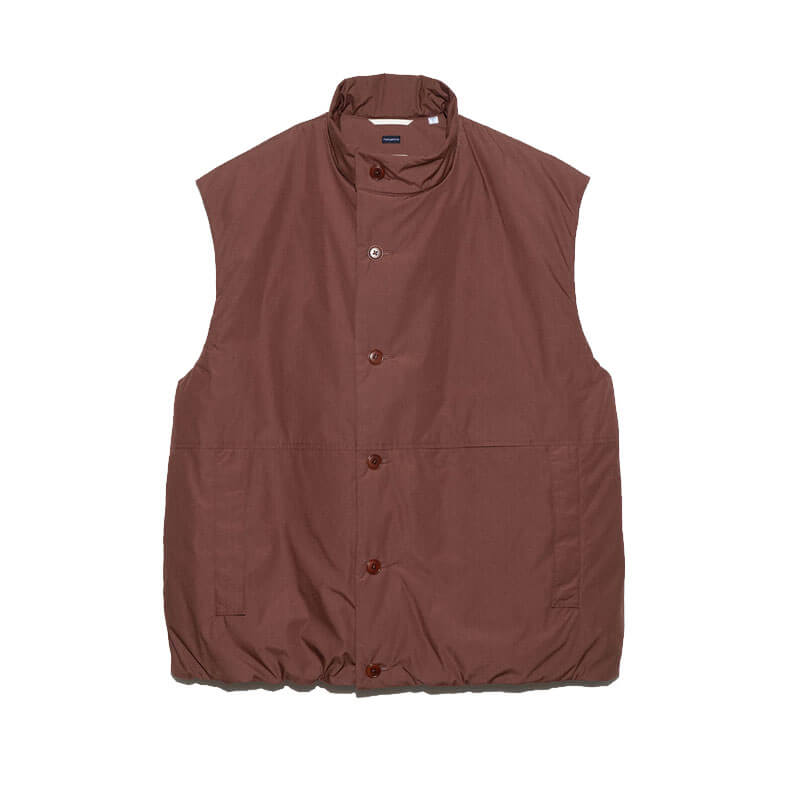 NANAMICA Insulation Vest – Brick: Insulated vest designed with a deep front overlap for blocking the wind and maintaining warmth. Filled with PRIMALOFT® Insulation made of recycled polyester. Crafted in high density blend of 65% polyester and 35% cotton, traditionally used for classic outdoor wear and finished with non-fluorine water-repellant layer.