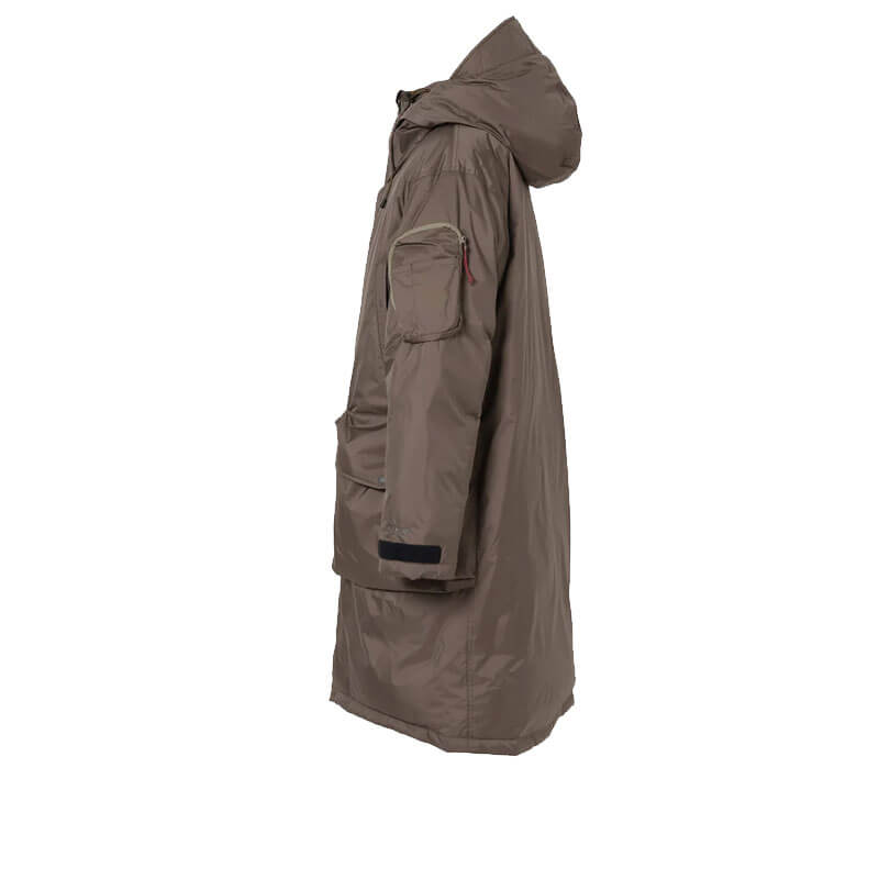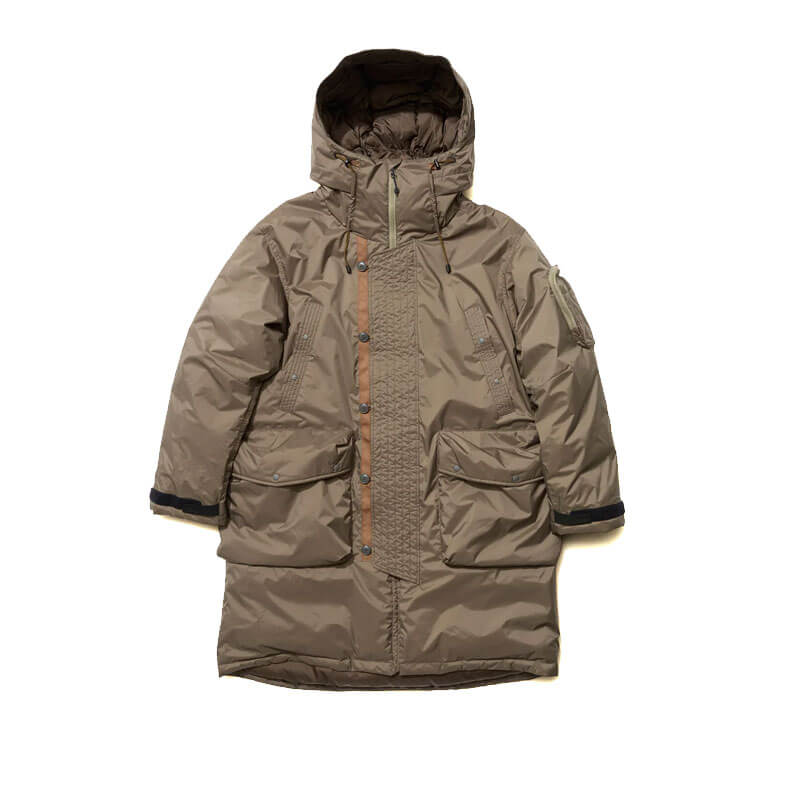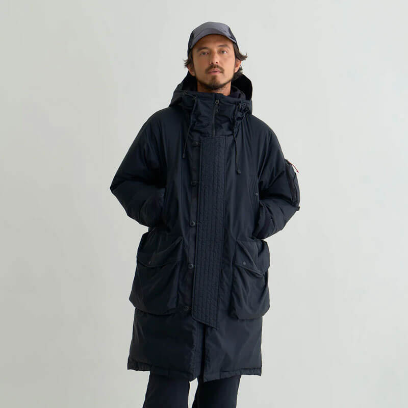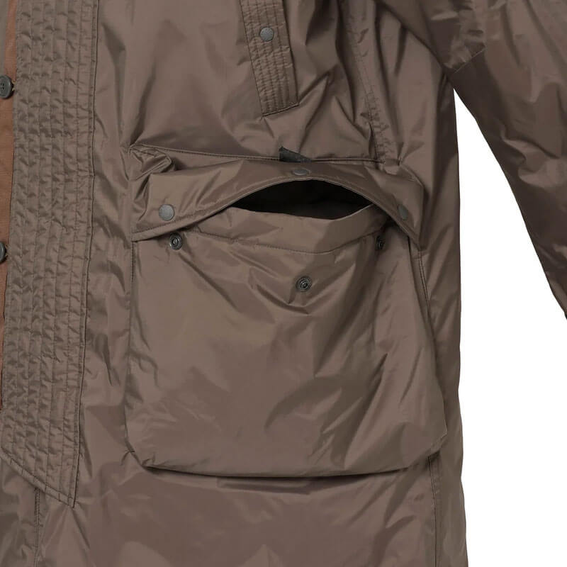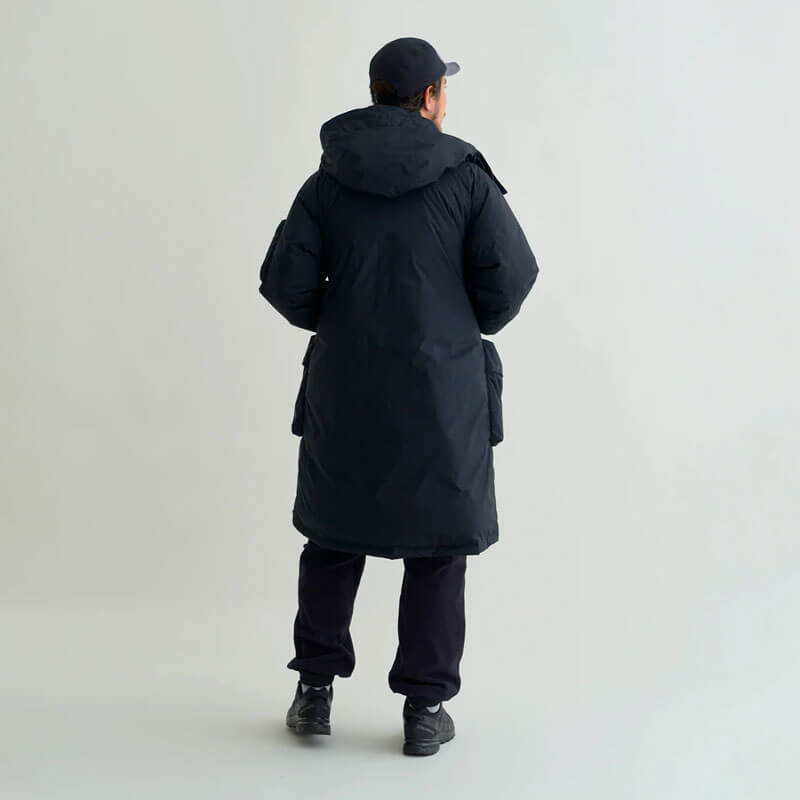 NANGA Aurora Tex Down Field Half Coat – Mid Grey: This knee-length coat with a loose silhouette, combines military-inspired style with high-performance features, perfect for urban and outdoor wear. Drawing from the design of the U.S. Air Force’s N-3B flight jacket, this knee-length coat provides warmth, functionality, and durability with NANGA’s exclusive Auroratex® fabric. Equipped with a large 3D waist pocket for essentials, hand-warmer pockets lined with soft tricot for added insulation, and a cigar pocket with a pen holder on the left arm for small items.