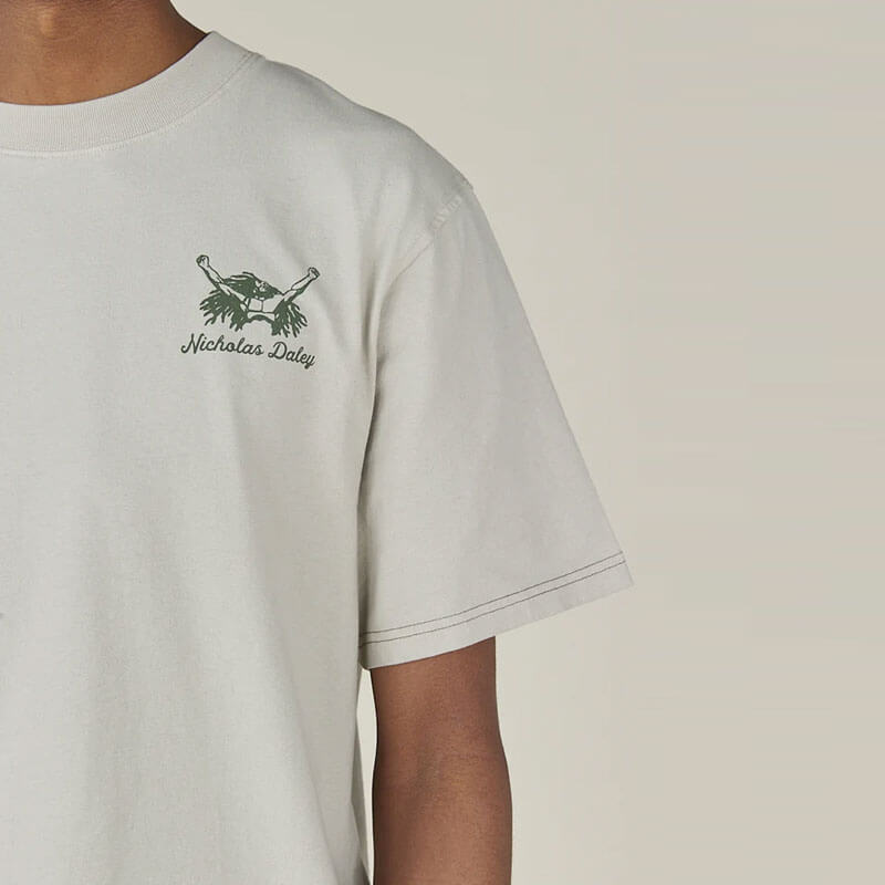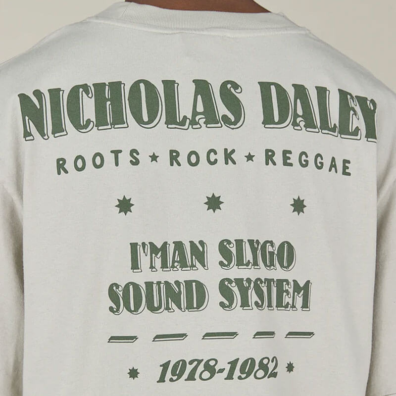 NICHOLAS DALEY Roots Reggae Tee – Silver: The Roots Rock Reggae Tee is made in Portugal from 100% cotton single jersey. It features the iconic “Reggae Klub Man” graphic on the front and “Roots, Rock, Reggae” printed across the back, paying tribute to the vibrancy of sound system heritage. A clean and expressive wardrobe staple, perfect for everyday wear with a cultural edge.