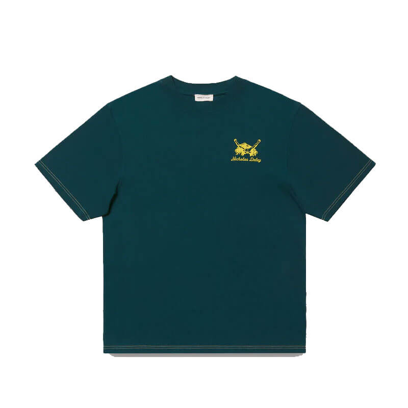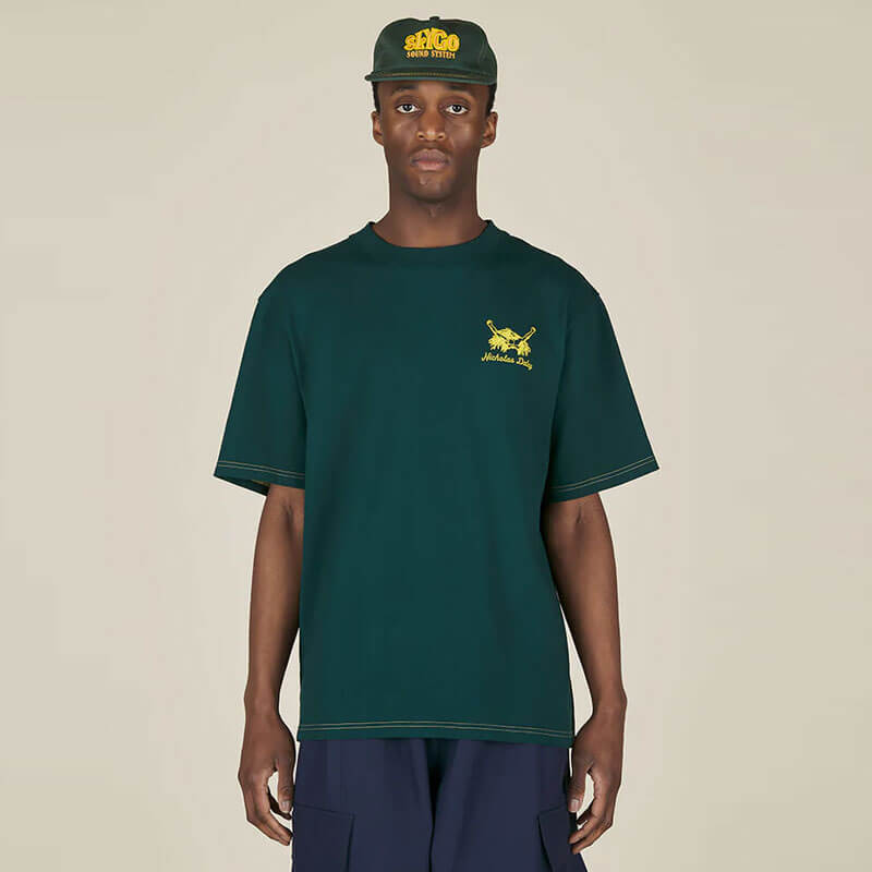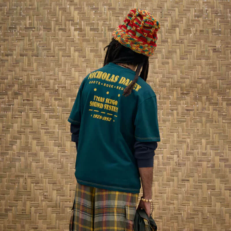 NICHOLAS DALEY Roots Rock Reggae Tee – Bottle Green: Short sleeve tee made in cotton jersey. It features ‘The Reggae Man’ screen printed artwork on the front chest and ‘Slygo Sound System’ on the back in the new seasonal bottle green colour.