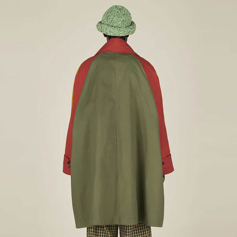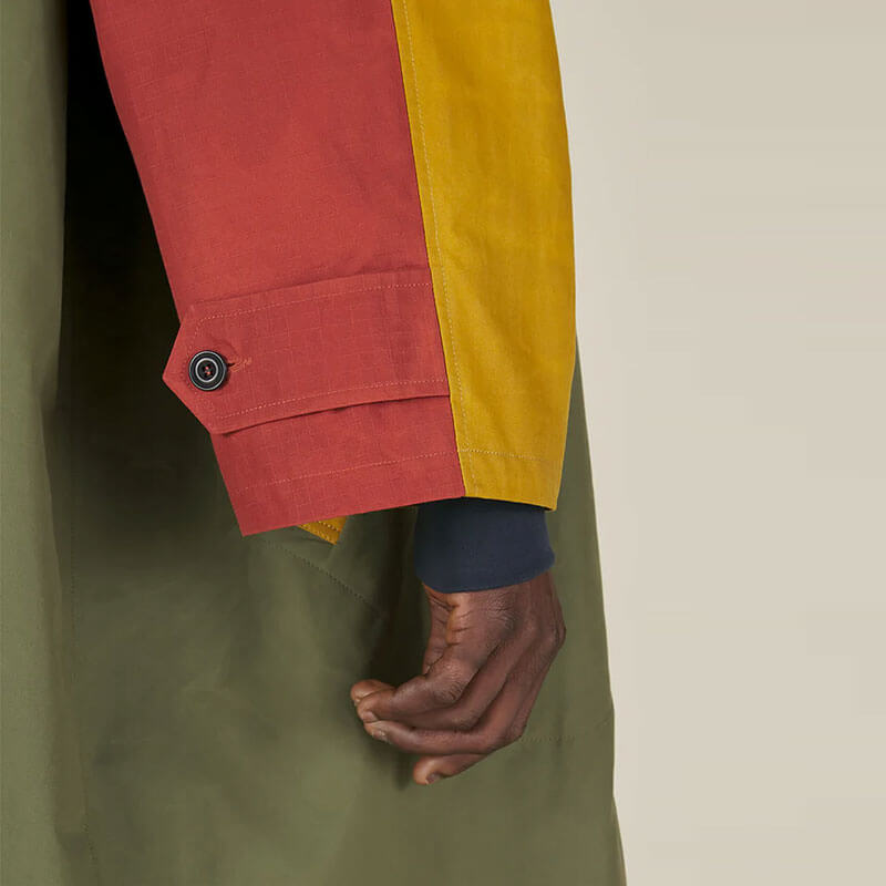 NICHOLAS DALEY Slygo Mac – Red / Green / Gold: Oversized coat with raglan sleeves, made In England from a 100% dry waxed cotton with contrast cotton ripstop details. The coat features raglan sleeves with contrast color on front and back and buttoned sleeve tabs. Two patch pockets with extra welt pockets, a zipped chest pocket and two internal patch pocket complete the design.