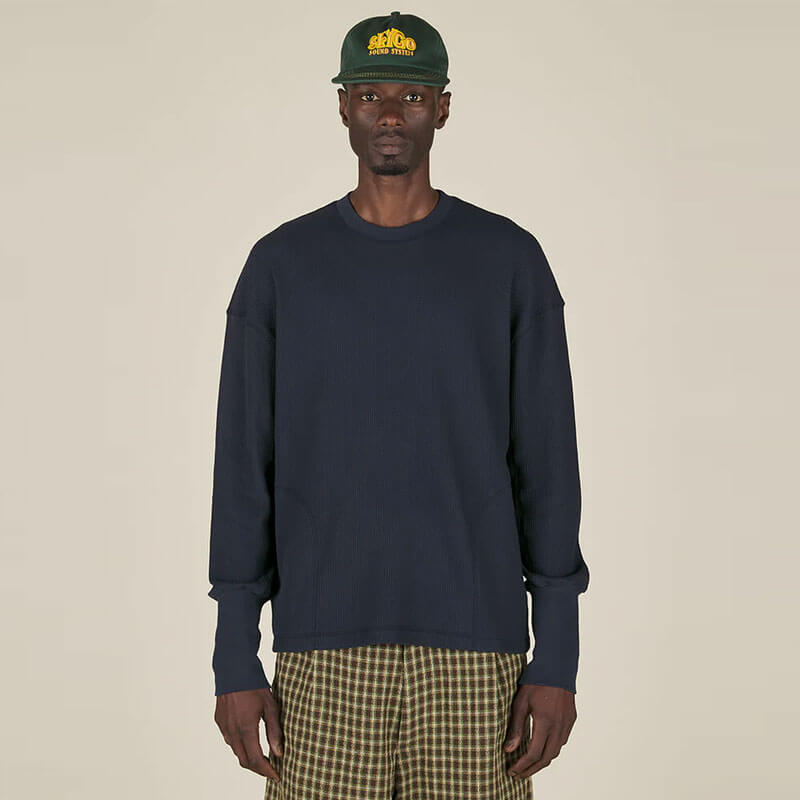 NICHOLAS DALEY Waffle Crewneck – Navy: Long sleeve pullover, made in Portugal from 100% mid-weight cotton waffle. The design features panelled detailing along the body, elevated sleeve cuffs, and inseam front pockets.