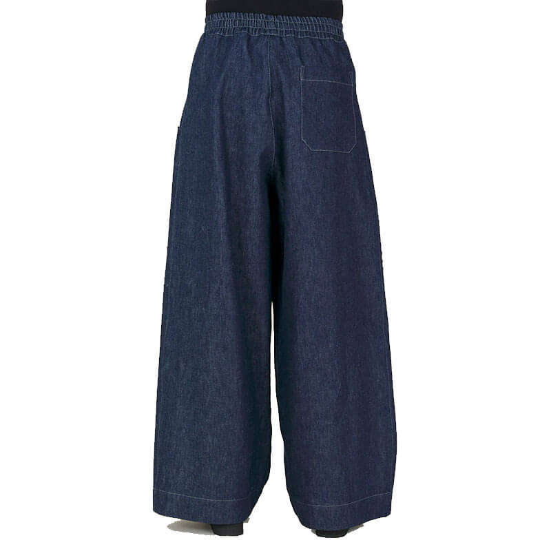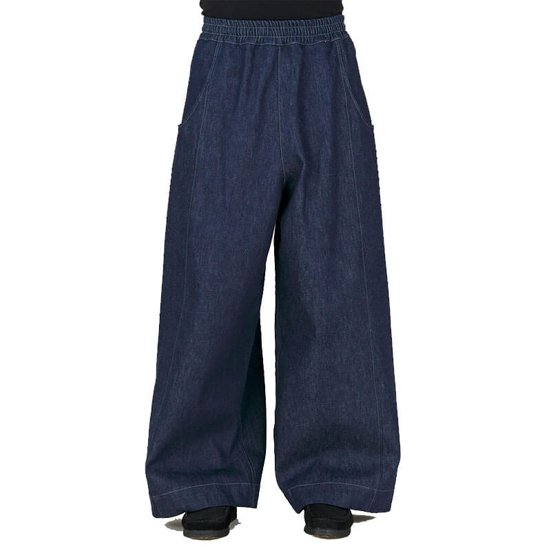 NICHOLAS DALEY Wide Leg Trouser – Dark Indigo: Wide Leg Trouser crafted in the UK from Italian dark indigo denim. Featuring an elasticated waistband with an internal drawcord, large side pockets with flat-felled seam panel details, and a single patch pocket on the back. A relaxed silhouette that combines function and refined craftsmanship.