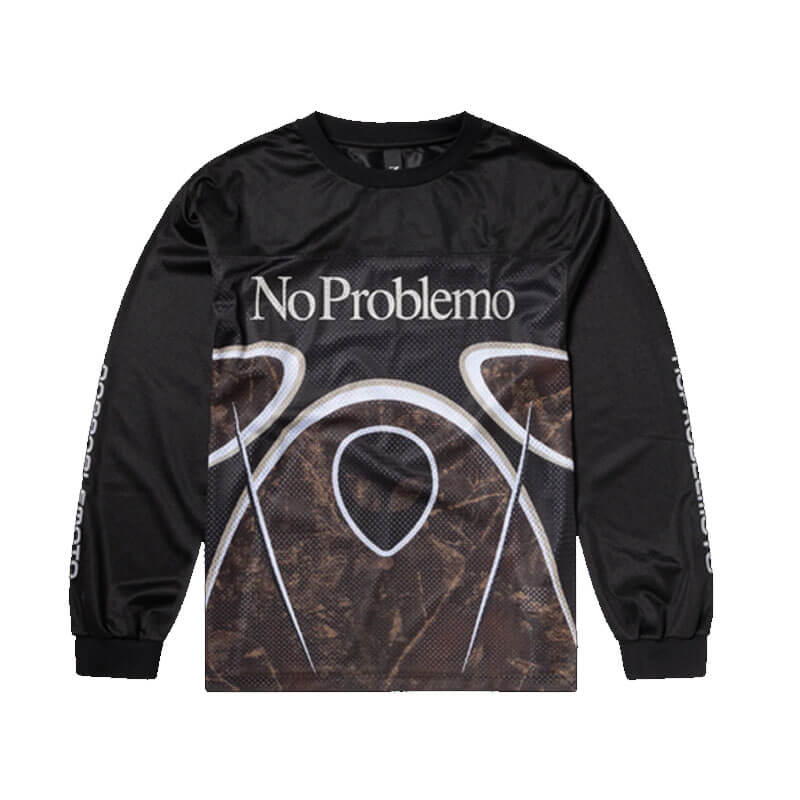 NO PROBLEMO Alien LS Moto Shirt – Black: Printed polyester and mesh moto shirt with Alien graphic print, tree camo allover print panel and ‘No Problemo’ logo screen printed on sleeve and reverse.