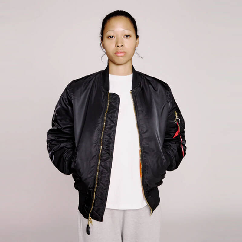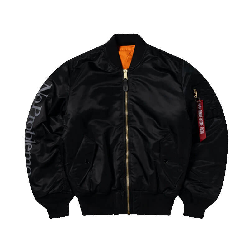 Included in the last Fall25 delivery, this NO PROBLEMO x ALPHA INDUSTRIES No War MA-1 Jacket – Black features: