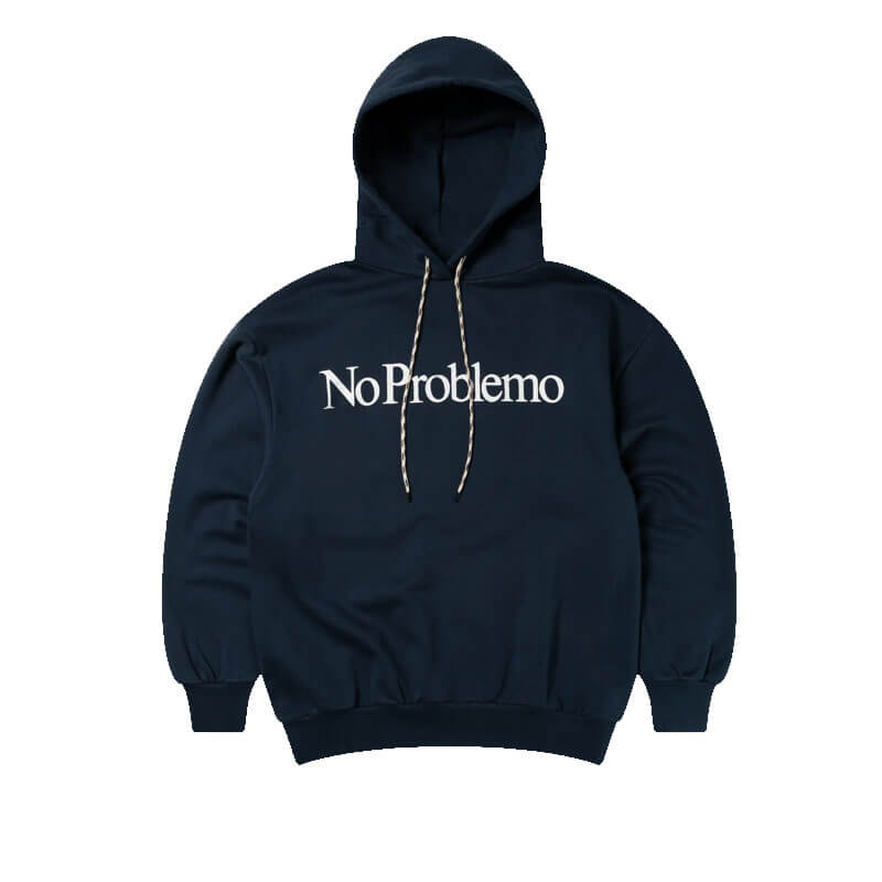 NO PROBLEMO No Problemo Hoodie – Navy: Unisex hooded sweatshirt made from brushed-back 100% cotton jersey fleece. Featuring a ‘No Problemo’ screen-printed across the chest.