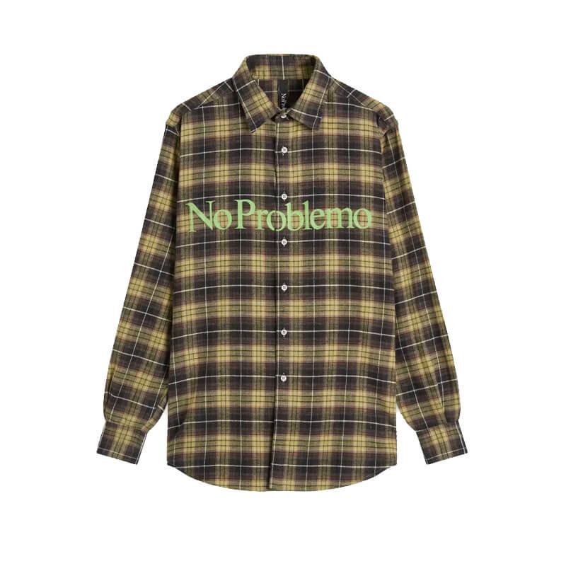 NO PROBLEMO No Problemo Plaid Shirt – Green: Classic long-sleeved shirt in plaid flannel fabric. Featuring a ‘No Problemo’ logo printed across the chest.