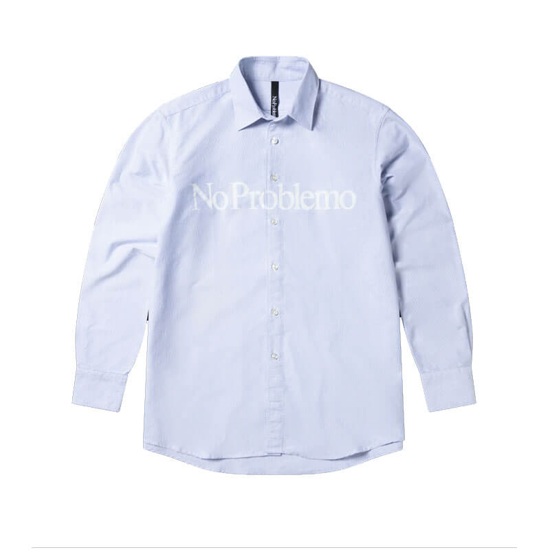 NO PROBLEMO No Problemo Stripe Shirt – Blue: Classic long-sleeve shirt crafted in a stripe cotton poplin fabric. Featuring a ‘No Problemo’ logo printed across the chest.