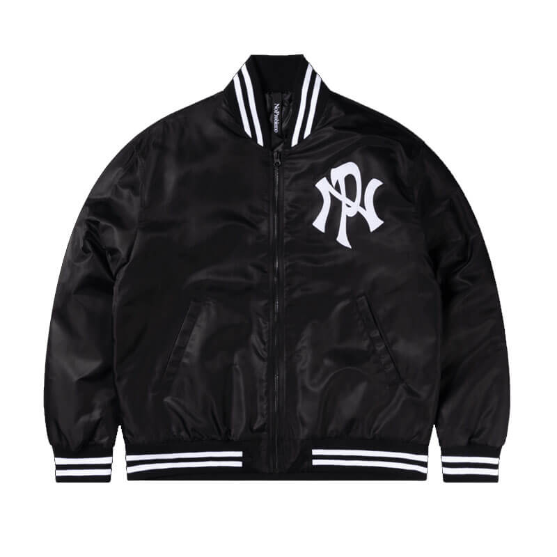 NO PROBLEMO Nylon Varsity Jacket – Navy: Nylon bomber jacket with front zip closure and stripe cuffs and neck. Featuring ‘NYP’ print on chest and two front pocket.