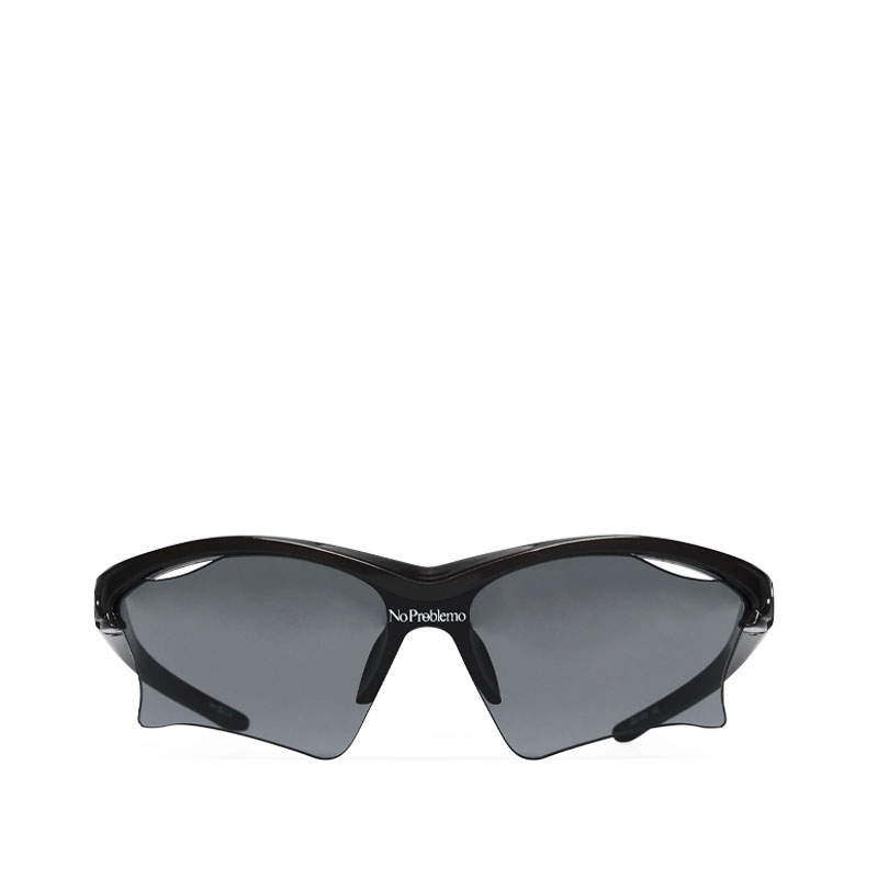 NO PROBLEMO x LE SPECS Pluto Sunglasses – Black / Smoke Mono: Designed with sleek and sweeping proportions, the pluto wraparound semi rimless shield sunglasses are a modern update on the early 2000s racer style. featuring cut out lens accents and three dimensionally moulded frame profile with signature alien head motif embossed into temple, this frame is finished with signature No Problemo logo lens print to centre front and tapered tubular temples for a comfortable fit.