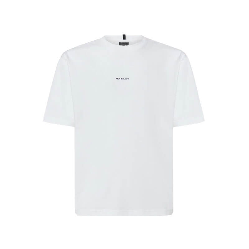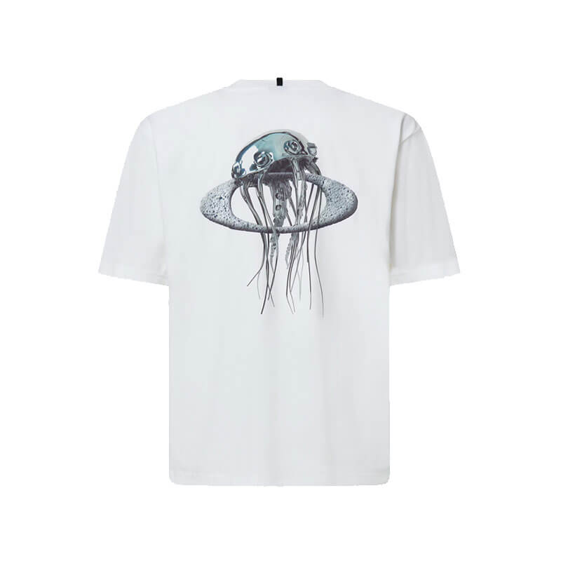 OAKLEY Futurescape Iced Jelly Tee – White: Boxy fit short-sleeve men’s tee whose minimalist front, plain with the exception of a small Oakley Bark chest logo, contrasts with the offbeat supernatural iced jellyfish screen print that takes center stage on the back, where it is joined by the leash holder detail. Made from soft peached cotton.