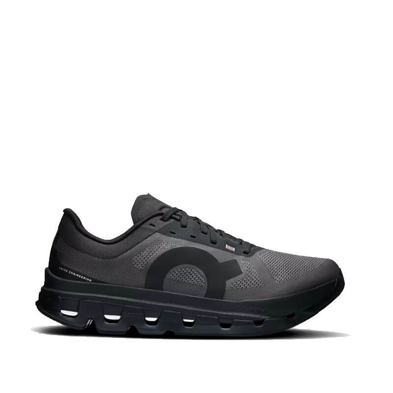 ON Cloudflow 5 – Black / Black: The training shoe for fast intervals. With Helion™ HF hyper foam and a nylon-blend Speedboard® for high energy return.