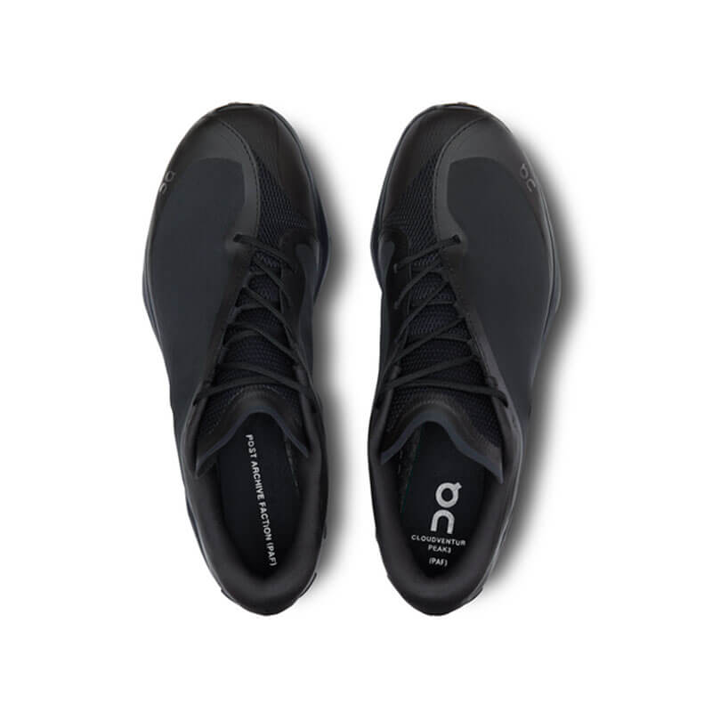ON Cloudventure Peak PAF – All Black: A special-edition shoe created by On × POST ARCHIVE FACTION (PAF), with a low profile silhouette and lotus stem-inspired aesthetic.