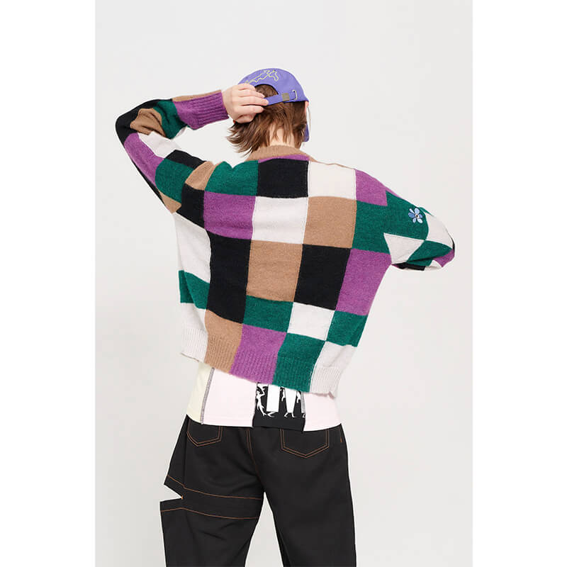 - Asymmetrical checkerboard intarsia knit