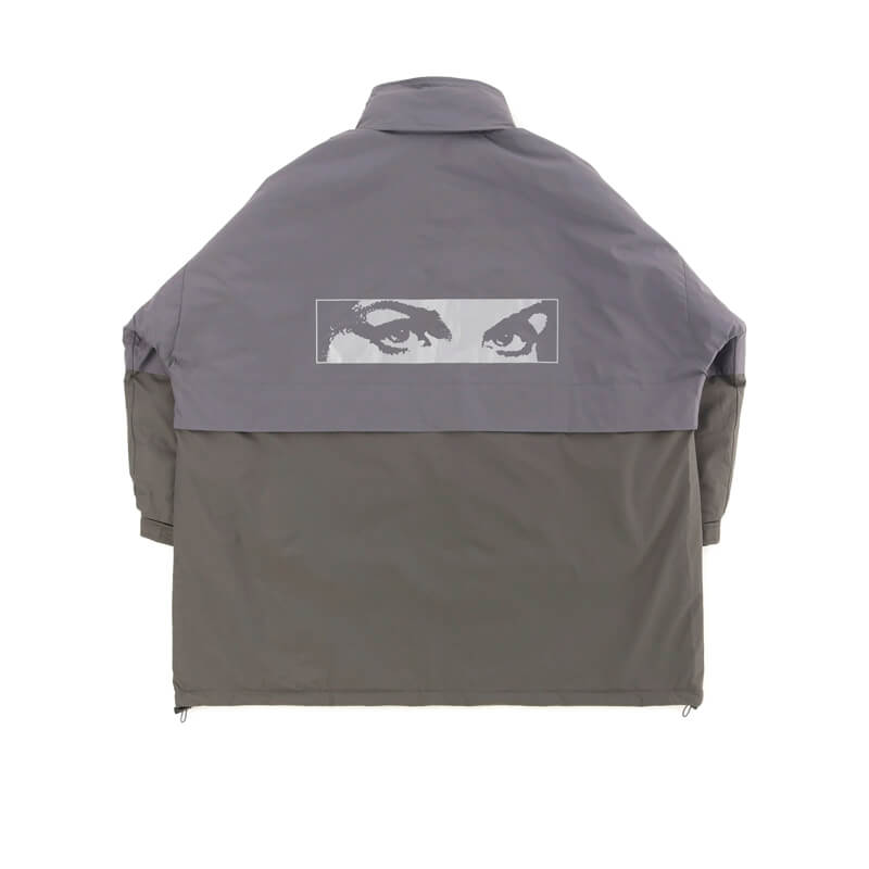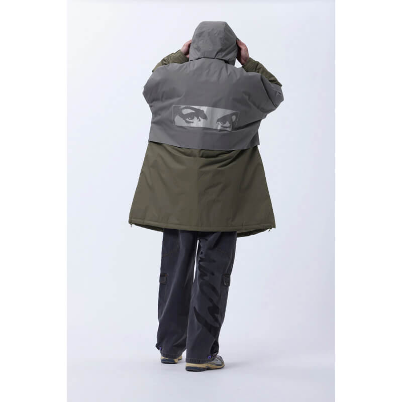 P.A.M. (Perks & Mini) Free Flowing Oversized Coat – Cement: Waterproof and reversible oversized long coat with tonal panels at the sleeves, back and front pockets and a large ‘Handmaiden Eyes’ reflective print at the back. The coat also features a stowable hood, adjustable sleeve cuffs, articulated front pockets, chest flap pocket and adjustable bungee cord at the hem. The reverse side is wave quilted with wadding, slanted welt pockets and a chest welt pocket. The reverse side also features herringbone tape attached along the top sleeve seam.