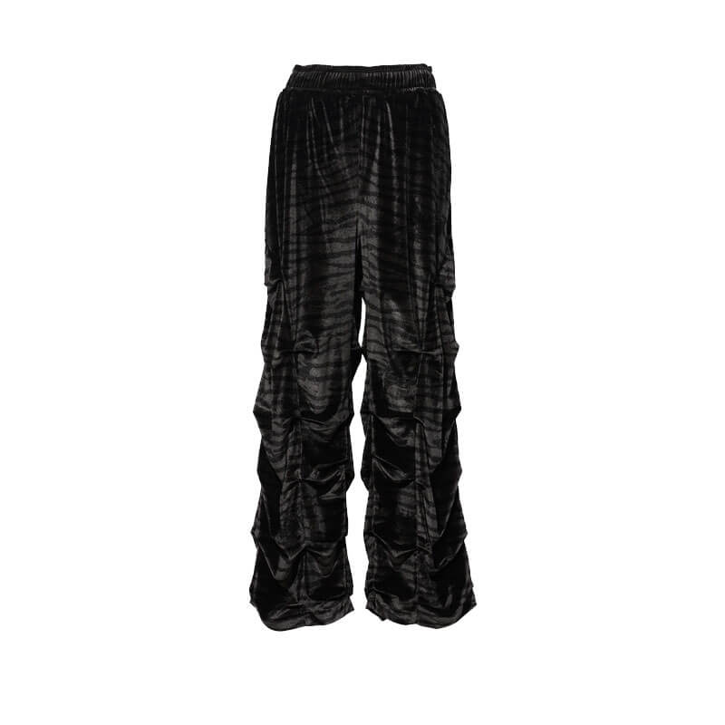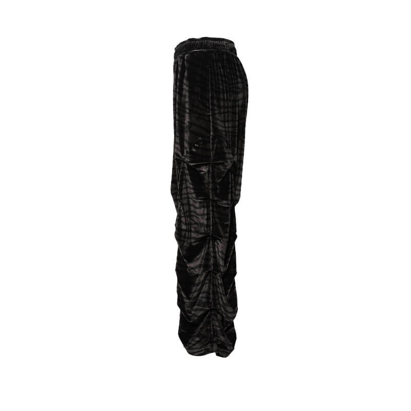 - Leg panel seam has random tucks, gathering the fabric along the front and back